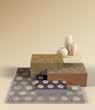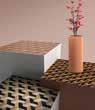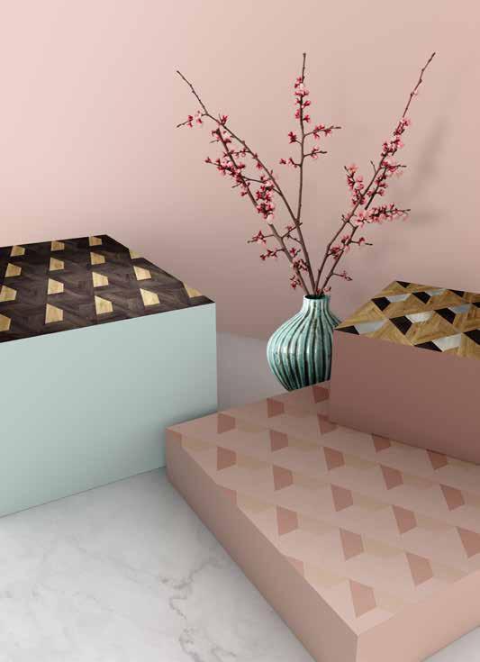 This unique pattern comes in different colour combinations: subtle with wood tones exclusively, more outspoken with an extra hue of grey, or simply striking with a popping dash of pink. Invigorate your room by matching your furniture and design accessories to the colours in the