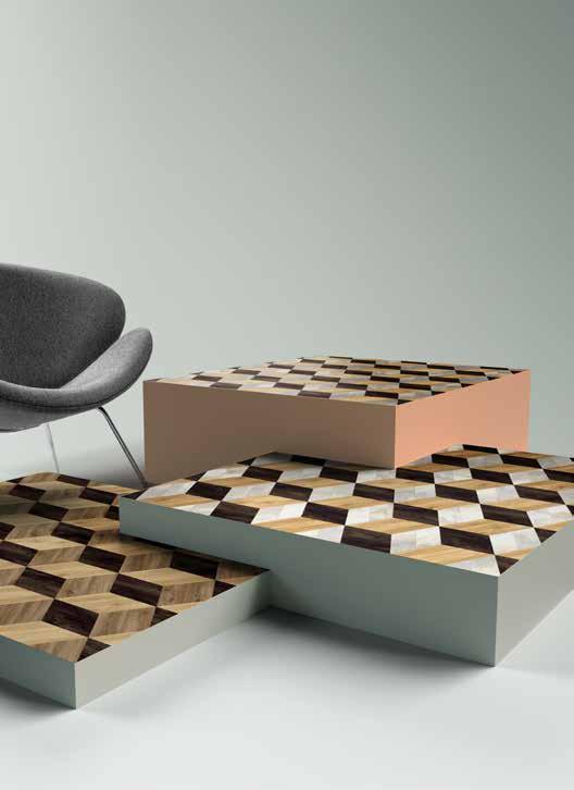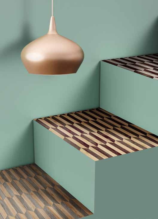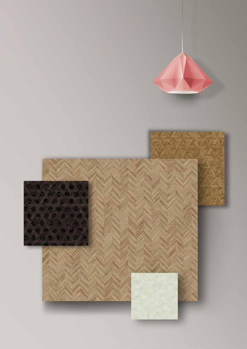 The triangle shape comes in three warm wooden tones, with which we created three unique multitextured patterns: a lively colour combination for every personality. The high contrast sets the tone while at the same time, it provides the perfectly complimenting background for your furniture.