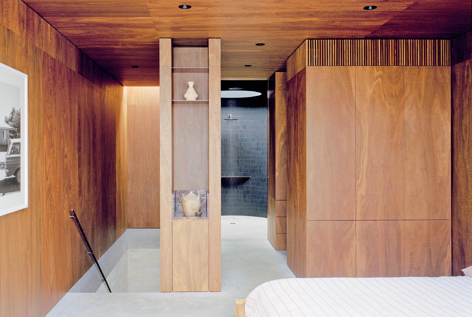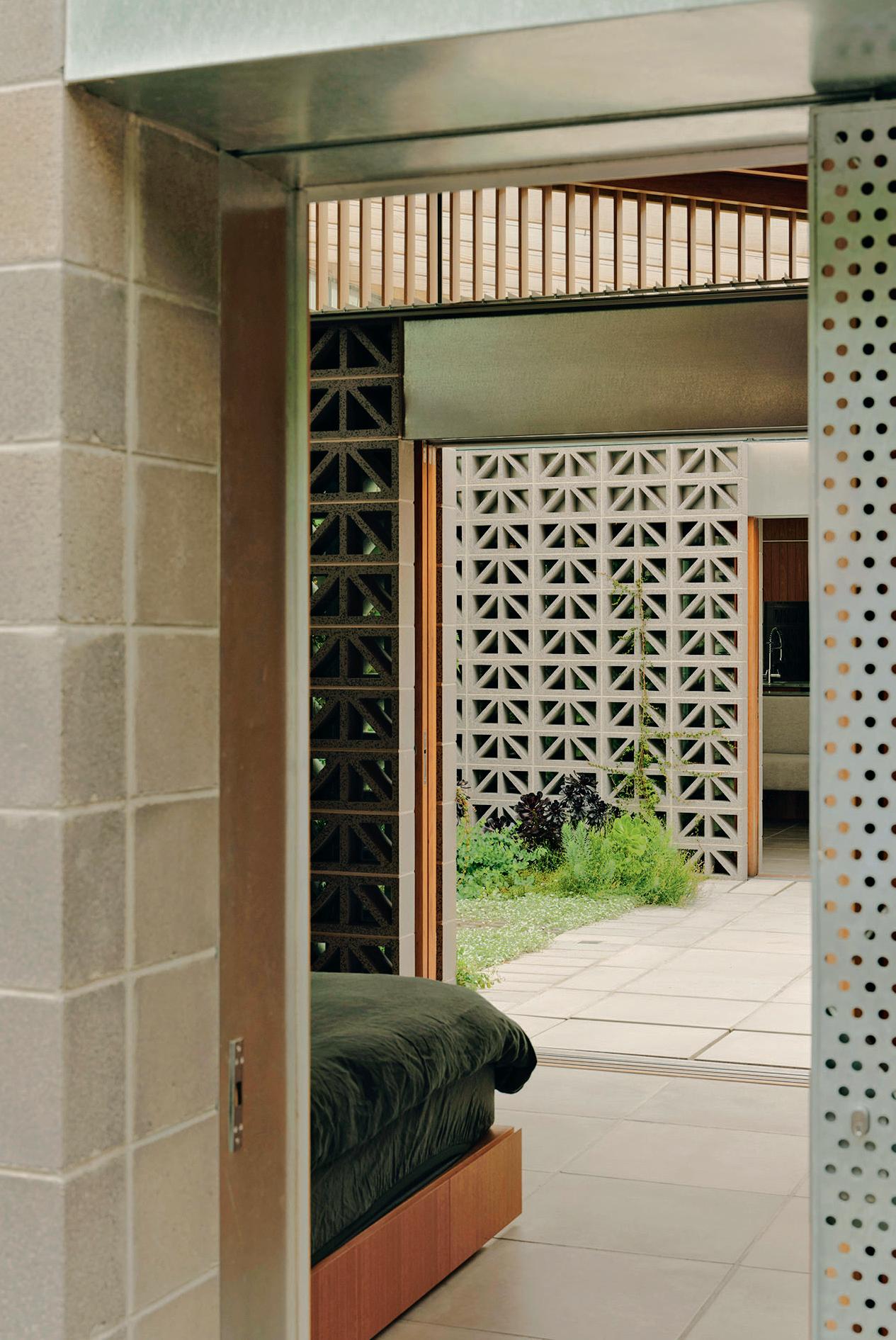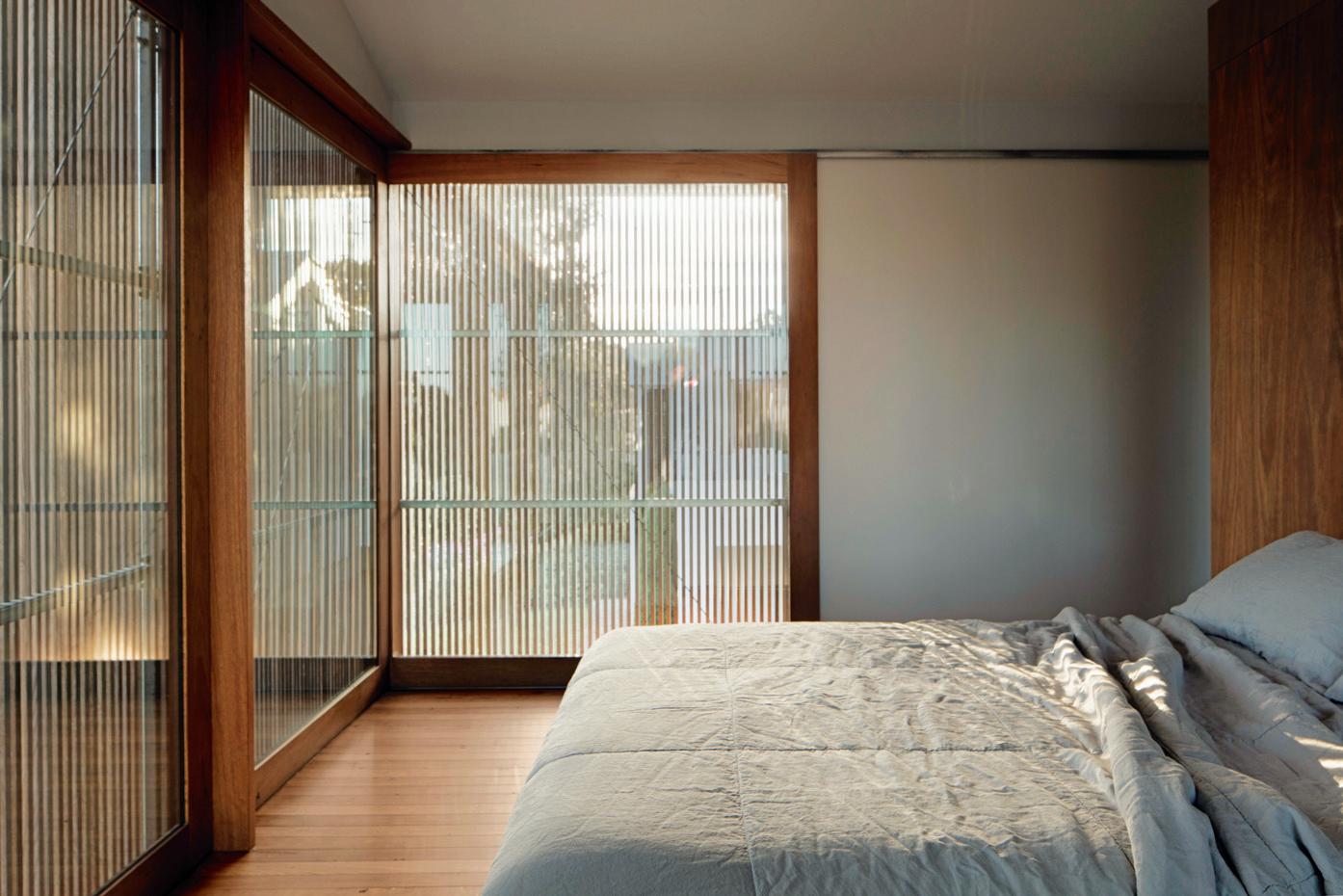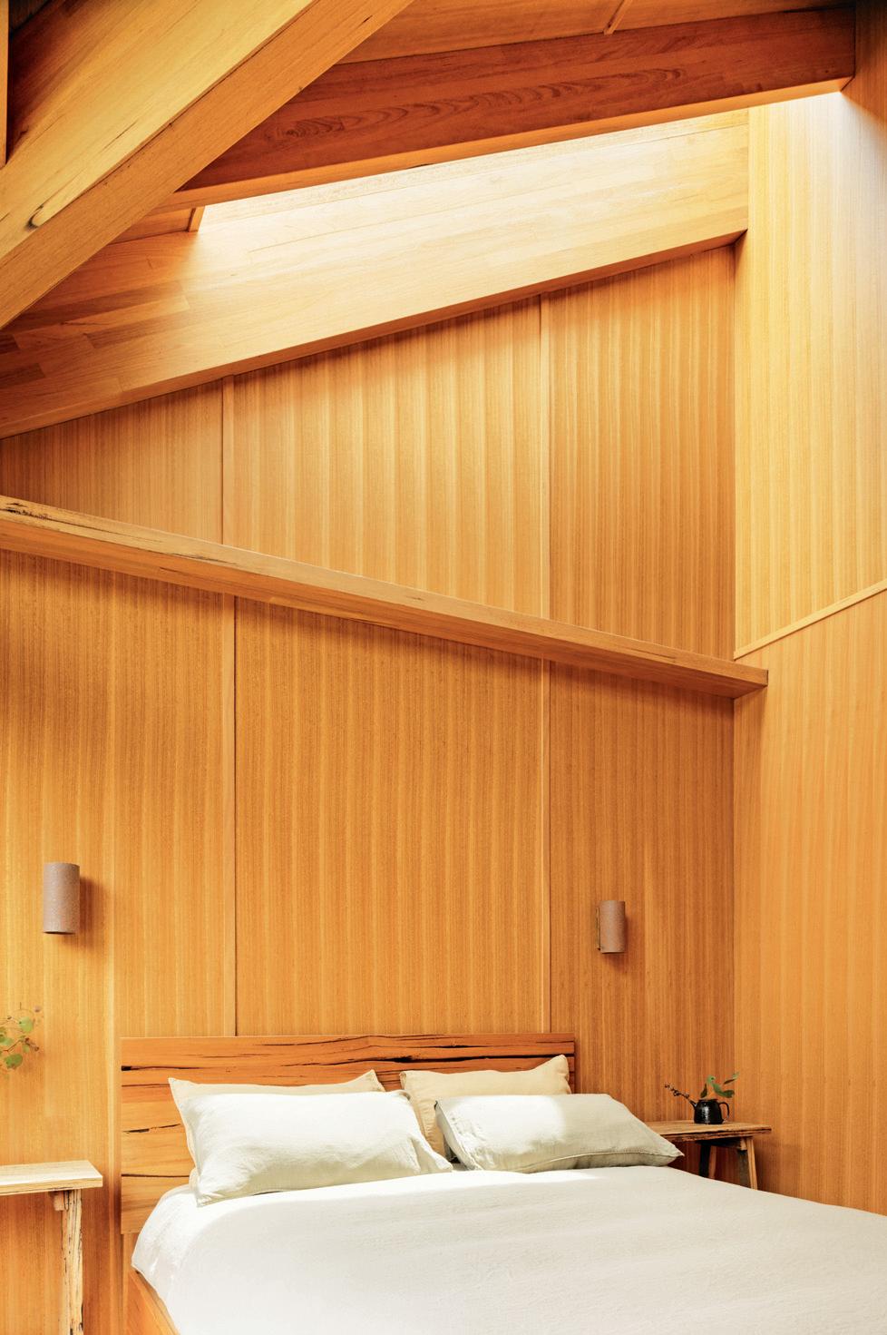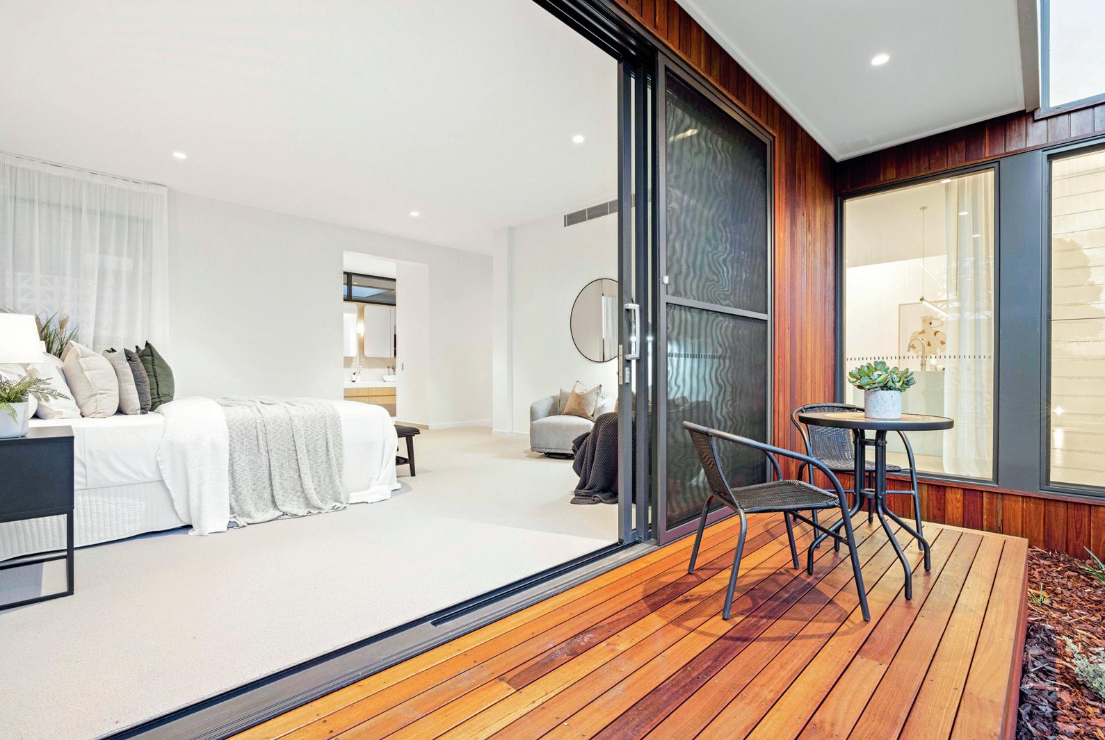 Commercial Series stacker doors (2.7m high) in the living, rumpus and master bedroom feature a rebated sill for a zero-threshold ease of passage between the interiors and lush outdoor landscape. The master bedroom offers tranquillity in a private retreat that is enveloped by the surrounding landscape. The ensuite, bathroom and bedrooms feature Commercial Series awning windows of varied custom confi gurations, where the sash is often positioned either above or below sightlines to reduce the visual obstruction of the surrounding landscape.