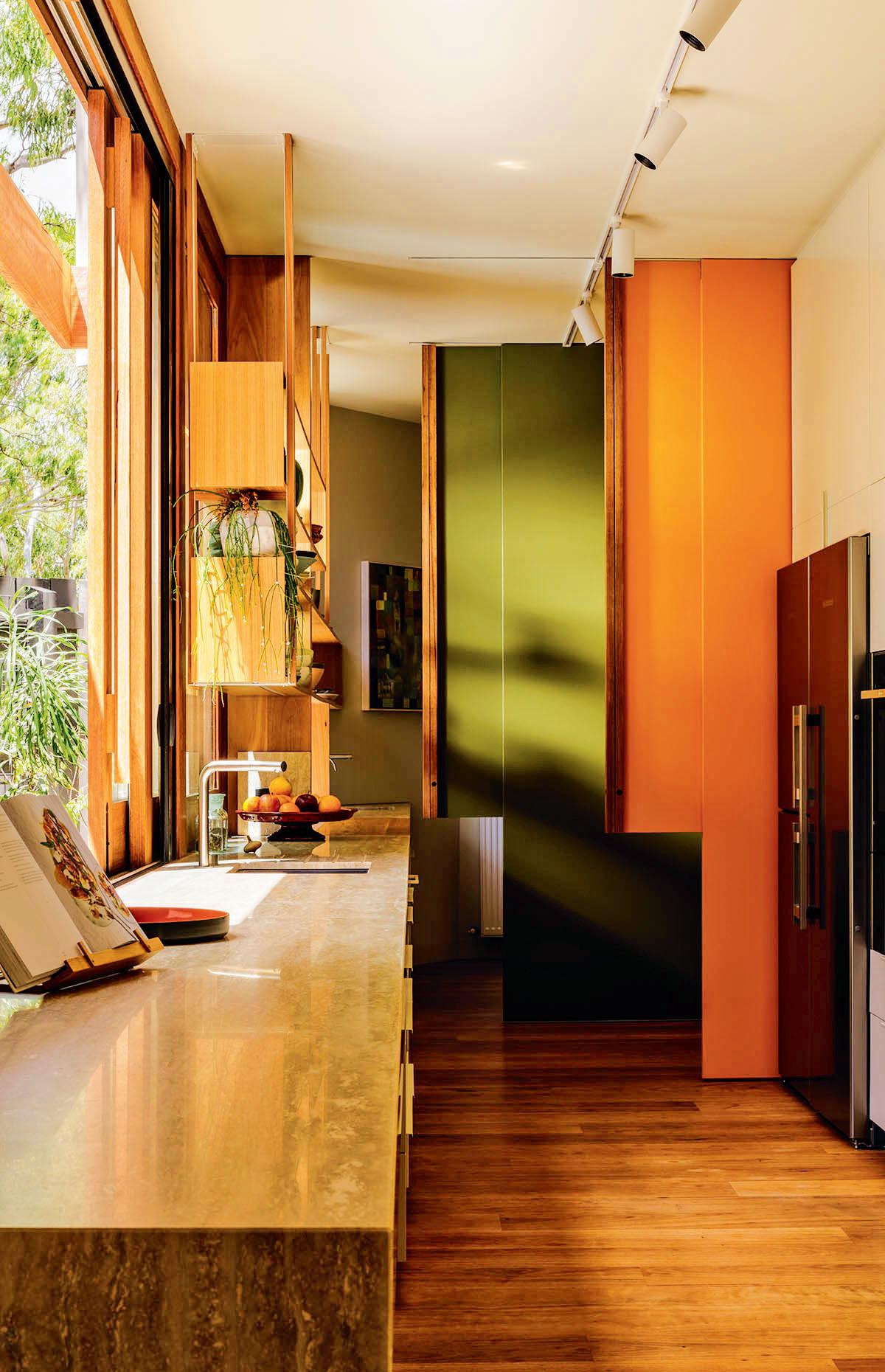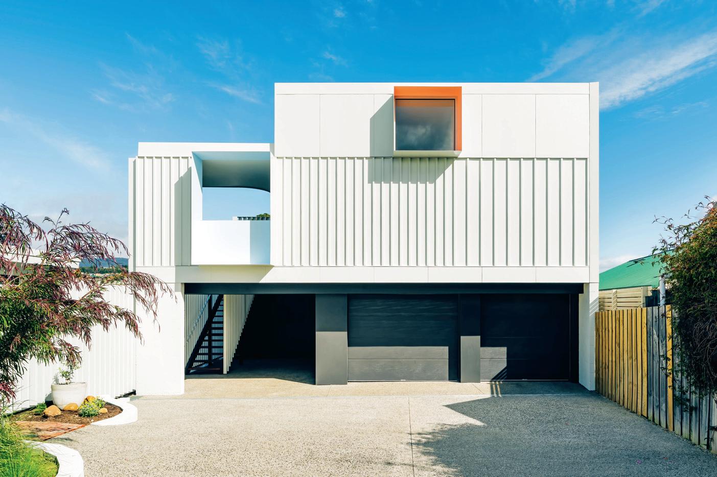 With expansive sightlines from the entry, the soaring 4.3m-high timber-lined v-joint ceiling leads the eye to the swimming pool and resortstyle entertaining area. The open-plan living, dining and kitchen are flooded with natural light to the north-west elevation through a series of louvre and fi xed lite windows. Louvre windows deliver maximum ventilation and promote cool sea breezes, ideal in a temperate coastal environment.