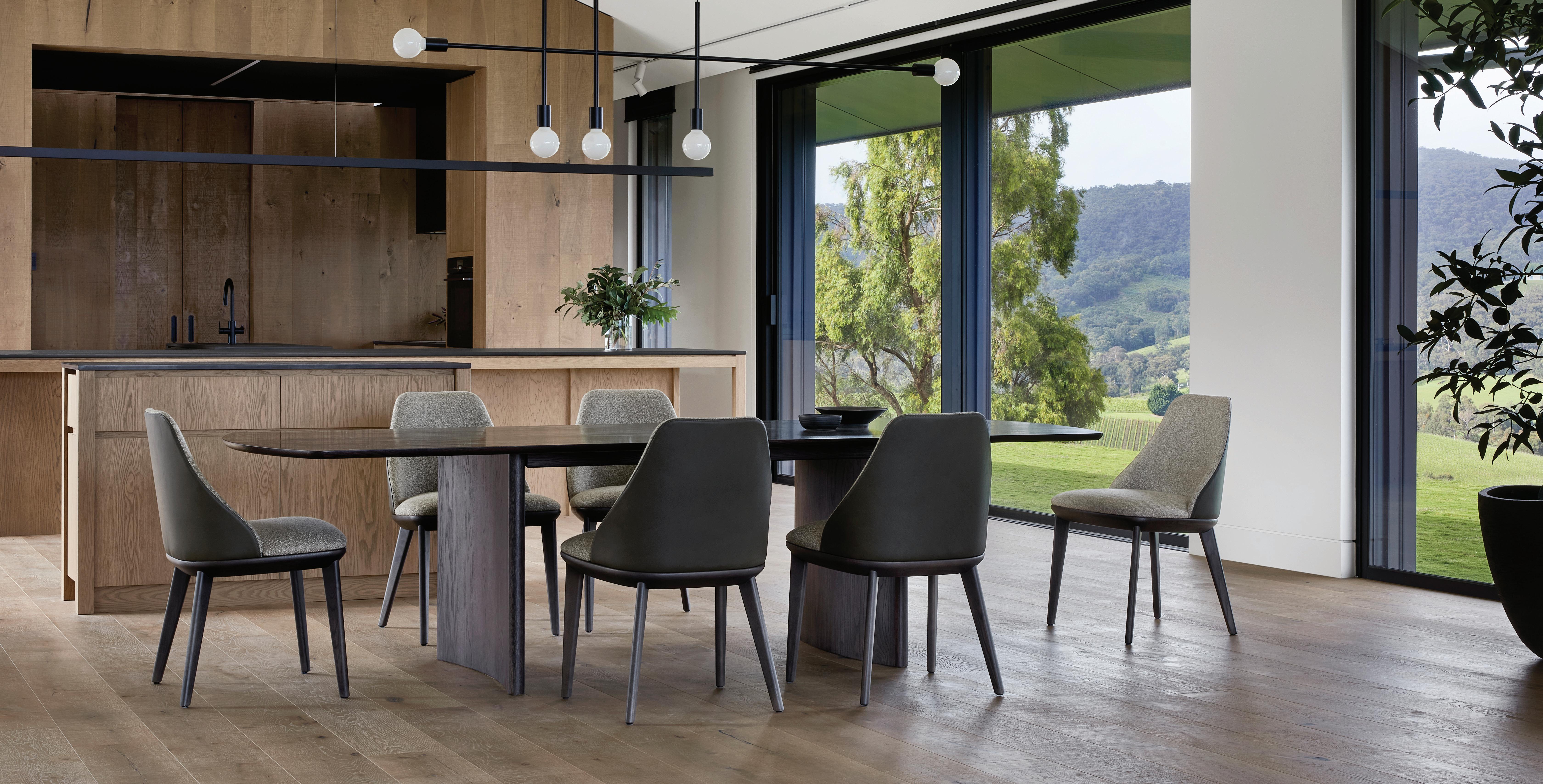 The Portland Arc Dining Table and Johanna High Back Dining Chair take centre stage in the home’s dining area, both grounded by timber in a moody charcoal stain that allows the timber grain to be expressed in its natural form. The Portland Arc Dining Table features gentle curves on the legs and table top that mirror each other and create a balanced effect. Finished in sumptuous green