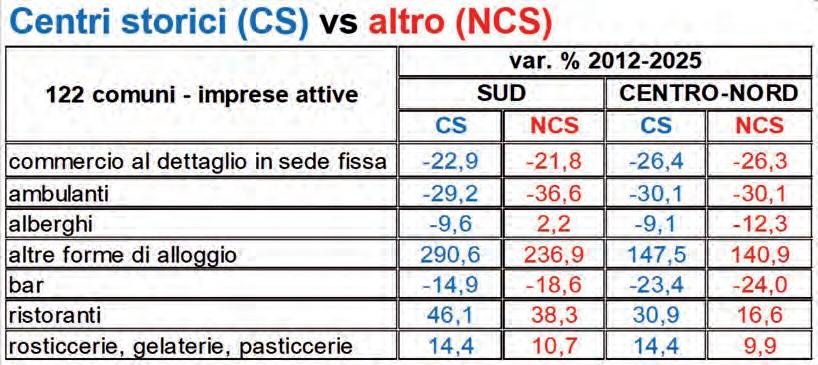 Le variazioni percentuali del numero di imprese attive nei centri storici, tra il 2012 e il 2025, evidenziano una forte ristrutturazione del tessuto commerciale urbano caratterizzato da meno commercio di prossimità e più attività orientate al turismo e alla ristorazione, con un progressivo cambiamento della funzione economica e sociale degli spazi urbani.