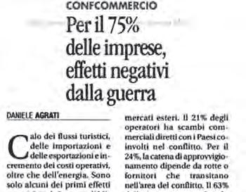 scambi commerciali diretti con i Paesi coinvolti nel conflitto. Per il 24% la catena di approvvigionamento dipende da rotte o fornitori che transitano nell’area del conflitto. Il 63% delle imprese ha subito blocchi o rallentamenti nella consegna delle merci provenienti dall’Asia.