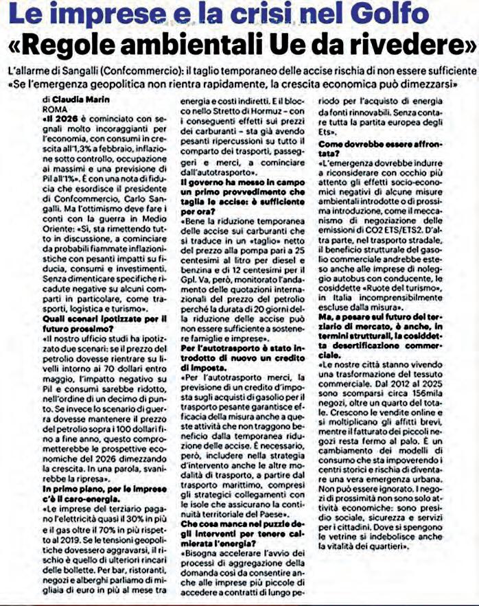 “Il 2026 è iniziato con segnali molto incoraggianti per l’economia: consumi in crescita fino all’1,3% a febbraio, inflazione sotto controllo, occupazione ai massimi livelli. Ma lo scenario di guerra rischia di vanificare la ripresa. Speriamo che il prezzo del petrolio torni entro maggio intorno ai 70 dollari, perché così si avrebbe un impatto su Pil e consumi molto modesto. Viceversa, se le quotazioni rimanessero sopra i 100 dollari fino a fine anno, la crescita sarebbe dimezzata”: così il presidente di Confcommercio Carlo Sangalli (foto) ha commentato i dati sulla Congiuntura dell’Ufficio Studi Confcommercio.