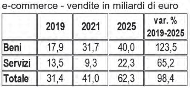 E-commerce e cambiamento dei modelli di consumo Il cambiamento dei modelli di consumo continua a incidere profondamente sulla struttura commerciale delle città. Nel 2025 le vendite online hanno rappresentato l’11,3% dei consumi totali di beni acquistabili e il 18,4% dei servizi, contribuendo a ridurre il numero di negozi fisici e modificando l’organizzazione dell’offerta commerciale. Ma soprattutto, a fronte di una variazione dell’indice di vendite al dettaglio totale, tra il 2015 e il 2025, pari a +14,4%, le piccole superfici sono ferme mentre l’online risulta quasi triplicato (+187%). Nel 2019 il valore delle vendite online era pari a 31,4 miliardi, nel 2025 è arrivato a 62,3 miliardi. La riduzione del numero di negozi fisici riduce – come in un circolo vizioso – l’attrattività commerciale delle aree urbane ed alimenta ulteriormente la contrazione dell’offerta.