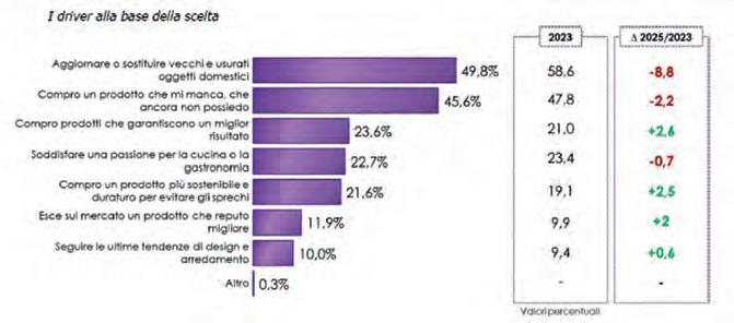 ● Rinnovamento: La motivazione principale è la sostituzione di oggetti usurati (49,8%), seguita dal desiderio di possedere prodotti nuovi o mancanti (45,6%).