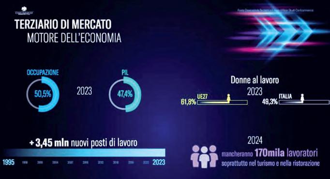 sione concreta di responsabilità”. Quella responsabilità che servirebbe per “contrastare una volta per tutte, anche con interventi normativi, il dumping contrattuale, i contratti pirata” rafforzando così “il ruolo della contrattazione esercitata da chi realmente rappresenta il mondo del lavoro e il mondo delle imprese” affermandone in tal modo “la valenza erga omnes: è la risposta più efficace alla questione del salario minimo”. Il presidente di Confcommercio ha quindi lanciato un appello a “proseguire nella riduzione del cuneo fiscale sul costo del lavoro” e a “valorizzare la sinergia tra welfare pubblico e welfare contrattuale e aziendale” aggiungendo la necessità di “più formazione e di più lavoro, anche con la programmazione di adeguati flussi di immigrati”. Sangalli ha poi evidenziato come, nonostante la produttività stagnante e le condizioni della finanza pubblica, il nostro Paese abbia “recuperato, in termini economici, ciò che sembrava impossibile, cioè i nove punti di prodotto lordo persi nel solo 2020, andando persino oltre di quattro punti e mezzo rispetto ai livelli pre-pandemici”. Vi ha contribuito enormemente il turismo che “sta registrando performance straordinarie e che quest’anno