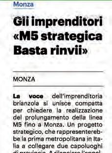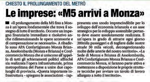 Istituzioni coinvolte affinché vengano stanziate le risorse mancanti a coprire tutti i costi, in modo da completare l’iter procedurale e avviare i cantieri nel più breve tempo possibile”. Dalle imprese piccole medie e grandi, al commercio di vicinato, alle filiere produttive passando per l’artigianato locale, tutti questi comparti da tempo attendono la realizzazione del prolungamento della M5, strategico sia in termini di competitività per le nostre aziende sia per la capacità di attrarre nuovi investimenti sul nostro territorio, con positive ricadute non solo per il tessuto economico ma anche per l’intera collettività. Con questo spirito occorre fare sistema concretamente con tutti gli stakeholder coinvolti. Confcommercio Monza, la Sede di Monza e Brianza di Assolombarda, APA Confartigianato Monza Brianza, si fanno parte attiva mettendo a disposizione le proprie strutture tecniche per avviare un tavolo di lavoro allargato a tutto il territorio.