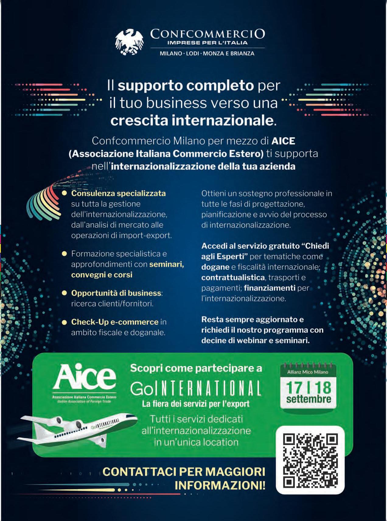 AMilano Allianz MiCo GATE 3, il 17 e 18 settembre, si svolge la quinta edizione di Go International®, la fiera dei servizi per l’export organizzata da Aice, l’Associazione italiana commercio estero, con Trade Events. La nuova edizione arriva dopo il successo dell’edizione 2024 che ha registrato un incremento del 25% degli espositori e del 20% dei visitatori. Quest’anno a Go International c’è la novità dell’Area B2B, spazio esclusivo dedicato agli incontri business to business tra aziende italiane e selezionati buyer internazionali. Con un’agenda di appuntamenti pre-organizzati, l’imprenditore ha l’opportunità di entrare in contatto con operatori esteri realmente interessati ai prodotti da esportare.