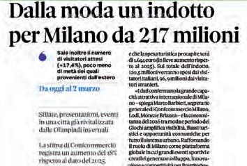 “La crescita dell’indotto della Milano Fashion Week – ha affermato Marco Barbieri, segretario generale di Confcommercio Milano, Lodi, Monza e Brianza - conferma la grande capacità attrattiva internazionale di Milano e assume un valore ancora più significativo nel contesto unico in cui si svolge quest’anno: ancora nell’atmosfera di Milano Cortina fra la fine dei Giochi Olimpici e l’inizio di quelli Paralimpici. Una concomitanza, tra moda e periodo dei Giochi, che amplifica visibilità, flussi turistici e opportunità economiche per tutto il sistema urbano. Rafforzando il ruolo di Milano come piattaforma globale in cui grandi eventi sportivi e creativi generano sviluppo, innovazione e competitività per il territorio”.