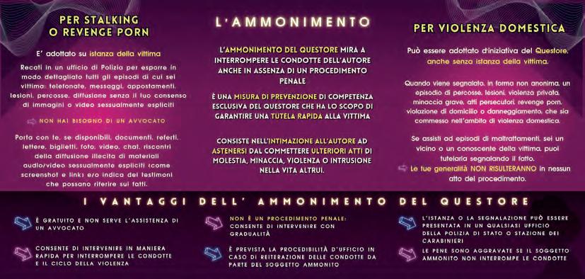 La seconda parte del volantino informativo della Polizia di Stato approfondisce i temi di stallking, revenge porn e violenza domestica. E spiega i vantaggi dell’ammonimento del Questore per interrompere condotte illecite anche in assenza di un procedimento penale in corso.