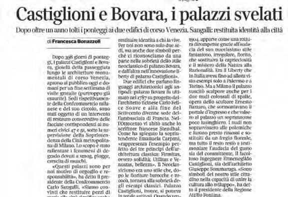 “Con il restauro dei Palazzi Castiglioni e Bovara vengono restituiti alla città due gioielli architettonici che fanno parte della storia e dell’attualità di Milano – ha affermato Sangalli - E sono attuali perché rappresentano bene il valore dell'arte e della cultura che si trasmette nel tempo grazie alla presenza della nostra realtà associativa imprenditoriale, e per questo diventano monumenti vivi che guardano al futuro”.