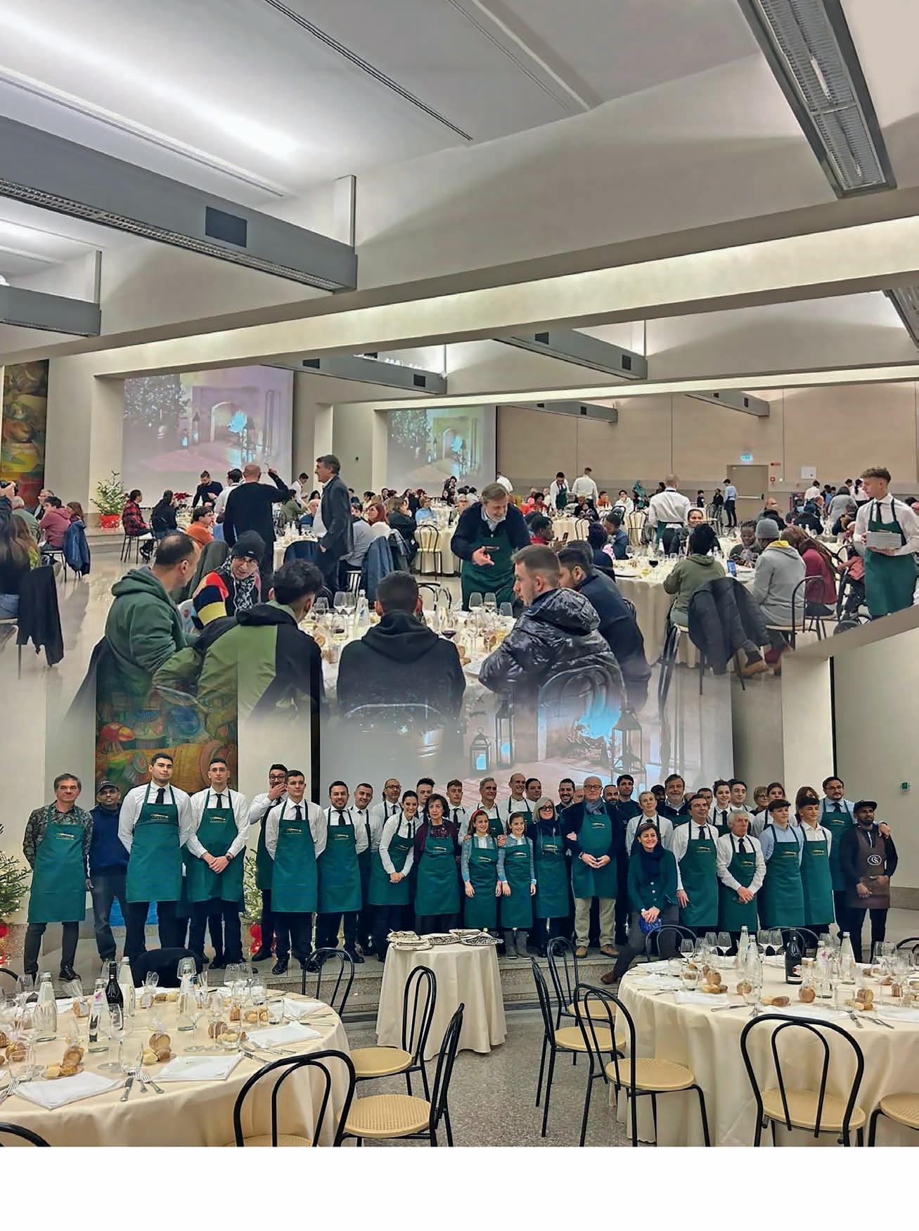 Un pranzo (servizio con i grembiuli dell'azienda Manzoli '51) che ha voluto essere un momento di gioia e d’amicizia nel segno della condivisione e della partecipazione alla sofferenza dei più deboli. Con la collaborazione di Caffè Scala il pranzo ha previsto alcuni classici come risotto alla milanese, lasagne, arrosto di vitello e patate, panettone e pandoro (e per i più piccoli un menu dedicato).