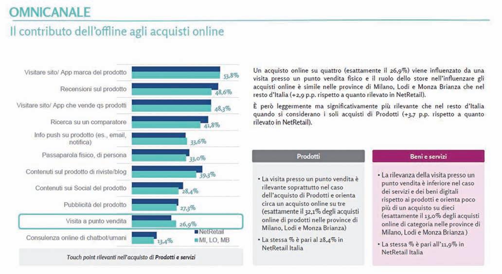 Digitale e fisico: un canale rafforza l’altro e viceversa L’ambiente digitale influenza anche gli acquisti tradizionali: prepara il terreno della decisione di acquisto che poi viene conclusa in un punto vendita e fa da supporto all’acquirente durante il momento decisivo dell’acquisto in store. Se si considera il totale delle categorie, dalla ricerca NetRetail 2023 emerge come il 41% degli acquisti in negozio effettuati da residenti nelle aree di Milano, Lodi e Monza Brianza sia influenzato da (almeno) un touchpoint digitale (quota simile alla media nazionale). Il sito del brand è il touchpoint digitale più utilizzato, seguito dai motori di ricerca e da siti di eRetailer. In queste aree si osserva una maggiore rilevanza dello store fisico nel determinare la scelta di acquisto online di un prodotto: il 32% degli acquisti online di prodotti è preceduto da una visita in store (+3,7 punti percentuali rispetto al totale Italia). Prima di un acquisto online vengono consultati tra i 3 e i 4