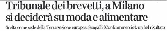 Carlo Sangalli “La scelta di Milano come sede della terza sezione del Tribunale Unificato dei Brevetti è una notizia molto positiva per il sistema imprenditoriale, per la nostra città e per il Paese. Oltre ai vantaggi in termini di costi per le imprese italiane che operano