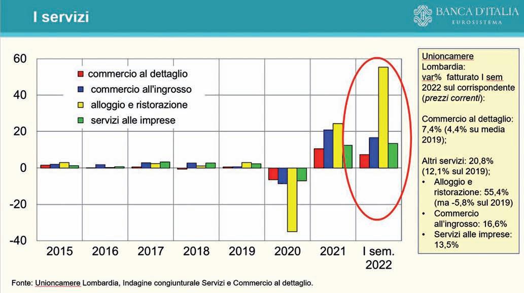secondo trimestre con il conflitto in Ucraina. Su questi macrodati di fondo il terziario registra una variazione percentuale positiva, nel primo semestre 2022, in particolare per ricettivi tà e ristorazione: + 55,4% (senza, però, poter ancora rag giungere i livelli pre-Covid del 2019: - 5,8%). Segno +, nei primi sei mesi 2022, anche per commercio all’ingrosso (16,6%), servizi alle imprese (13,5%) e commercio al dettaglio (7,4%).