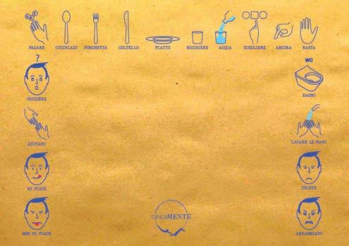 La tovaglietta “Io parlo con il dito” contiene i simboli più comuni rela tivi all’alimentazione e alla perma nenza nei locali. Indicandoli, la persona affetta da disturbo specifi co del linguaggio riuscirà più facilmente a comunicare.