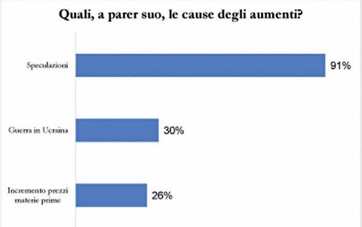 LA SPECULAZIONE (RISPOSTA MULTIPLA). E’ la speculazione la causa principale degli aumenti: lo ha segnalato il 91% delle imprese. La guerra in Ucraina viene indicata dal 30% e l’incremento dei prezzi delle materie prime dal 26%.