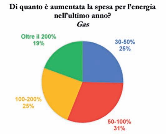 QUANTO E’ CRESCIUTA LA SPESA PER IL GAS – Di oltre il 200% per il 19% delle imprese e fra il 100 e 200% per il 25%. Il 31% registra aumenti fra il 50 e 100% men tre il 25% segnala rincari tra il 30 e il 50%. Maggiori incrementi di spesa del gas per alberghi/ricettività, risto razione, servizi.