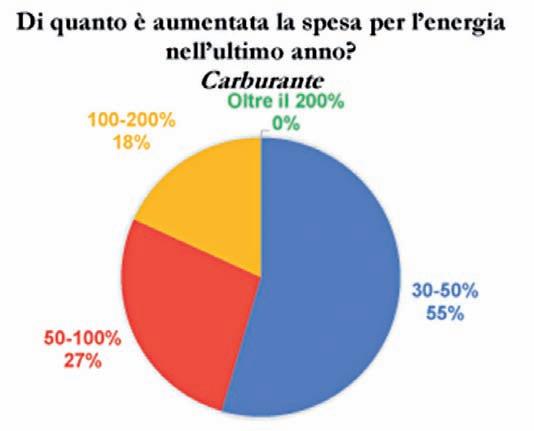 SPESA PER I CARBURANTI – Crescita fra il 30 e il 50% per oltre la metà degli operatori (55%) e fra il 50% e il 100% per il 27%. Il 18% segnala rincari fra il 100 e il 200%. Maggiori rincari per agenti rappresentanti di com mercio, dettaglio alimentare, servizi.