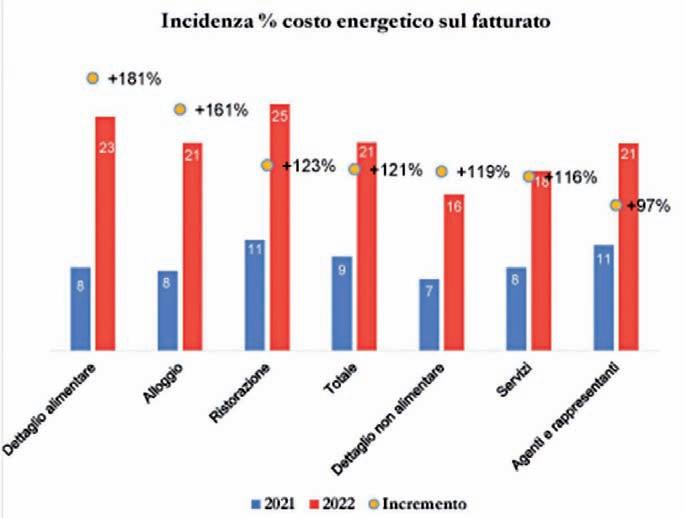 Dal+ 181% nel dettaglio alimentare al + 161% per alberghi-ricettività e + 123% per la ristorazione, al +119% e +116% rispettivamente per i negozi non alimentari e i servizi: è la sensibile cresci ta, in un anno (2022-2021), dell’incidenza percentuale dei costi per l’energia sui fatturati delle imprese del terziario. Con una media, per tutti i settori, del +121%.