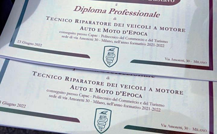 Siè svolta a Milano, presso la sede CAPAC (Politecnico del Commercio e del Turismo) di via Amoretti 30 (Quarto Oggiaro), la cerimonia di consegna dei Diplomi professionali di “Tecnico riparatore dei veicoli a motore – auto e moto d’epoca” ai diplomati 2021/2022. E’ stata inoltre l'occasione per l'incon tro con la nuova classe 2022/2023.