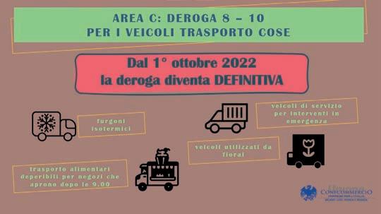 1° ottobre le dero ghe già in corso relative al divieto di accesso in Area C per i veicoli merci nella fascia oraria 8-10 del mattino sono diventate definitive. Come richiesto da Confcommercio Milano il Comune di Milano ha reso permanenti le dero ghe introdotte in via speri mentale nel 2016, che consentivano ad alcune categorie di veicoli di servizio di poter accedere in Area C anche dalle 8 alle 10 del mattino. Per le categorie non derogate, invece, vige (e continuerà ad essere in vigore) il divieto di accesso in Area C, dalle ore 8 alle 10 tutti i giorni da lunedì a venerdì feriali.