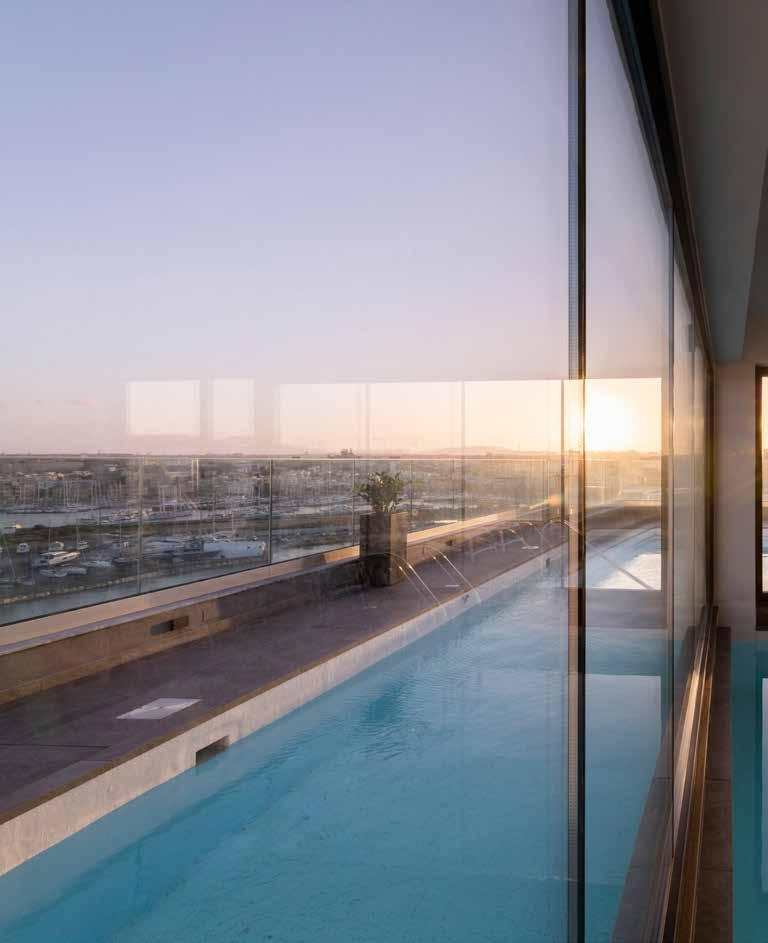 We gave particular attention to the spatial layout building on the architectural layout of the building that took into consideration the natural light and views overlooking the harbour and outwards to Valletta’s skyline. The room furniture, in particular the guest room beds, are laid out such that guests look outwards towards the view and the open sea as opposed to the inner harbour view. In addition, we laid out the public amenities to have the internal uses mainly across only two main floors (ground floor and level 1) whilst the pool deck at roof level in order to consolidate the spaces.