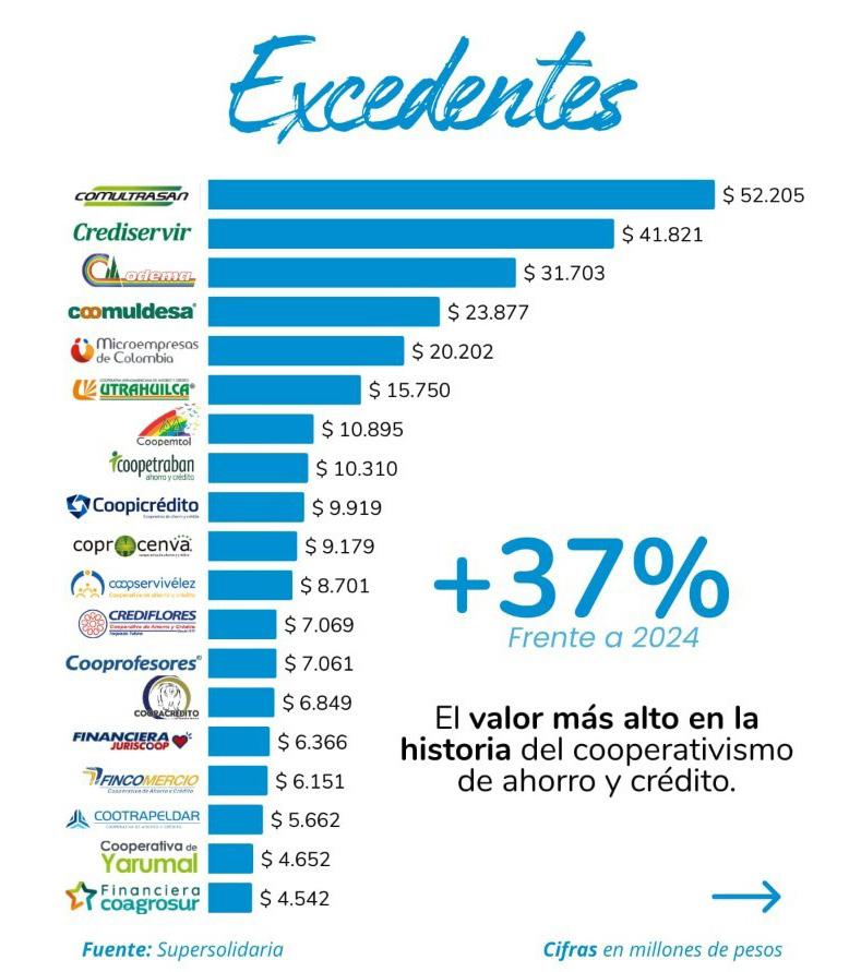 El sector solidario financiero, compuesto por cooperativas, asociaciones mutuales y fondos de empleados aumentó 37% sus excedentes en el 2025, comparado con el año 2024, consolidándose como uno de los renglones de la economía con mayor crecimiento.