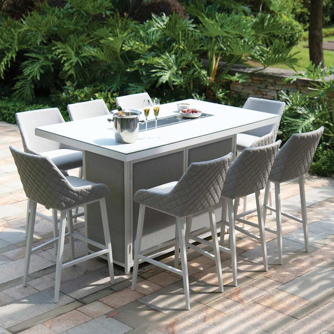 A key element in the ultimate al fresco dining experience is the table and seating, the gathering place for a delicious meal among beautiful scenery. This fire pit bar set is a prime option for an outdoor feast or fireside cocktails, whether for warmth or ambiance. Sure to impress your guests, the set includes eight bar stools, lava rocks, griddle pans, and the ability to seamlessly transform into a standard dining table.