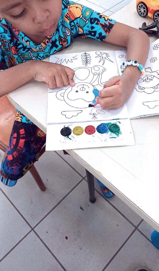 desenho livre, de retrato uns dos outros, confecção de carrinhos de sucata, artesanato, e técnicas de recorte e colagem. “Em muitos casos as crianças se expressavam desenhando nuvens, chuvas e elementos que remetiam ao cenários que estavam vivendo, mas incentivamos a desenhar o sol e um arco-íris para tentar mostrar que aquilo tudo era