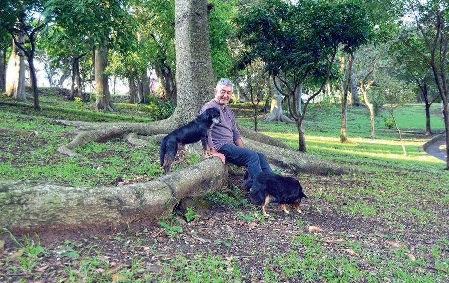 Por sinal, Justino Pereira, sentado numa enorme raiz de uma Figueira, junto dos seus cachorros, Petruco e Belinha, diz que gosta de ficar em silêncio no parque, enquanto os animais aproveitam o espaço. “Fico pensando em mudar alguma coisa, menos mudar o mundo, que ninguém muda nada”, conta enquanto ri.