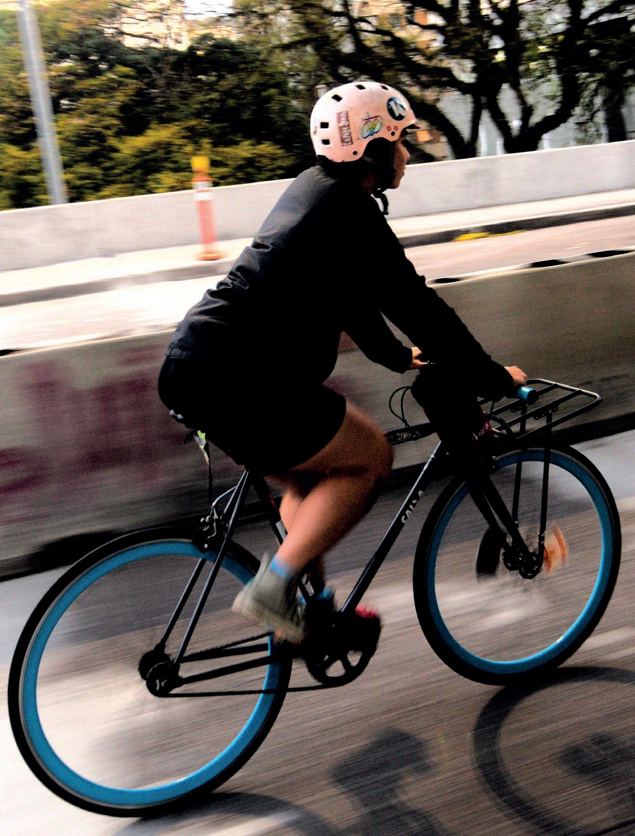 Parar e poder observar a cidade de outra perspectiva é um dos motivos para Thainá pedalar em média 50km nos dias em que trabalha como bike messenger