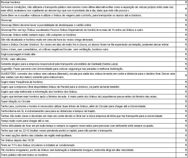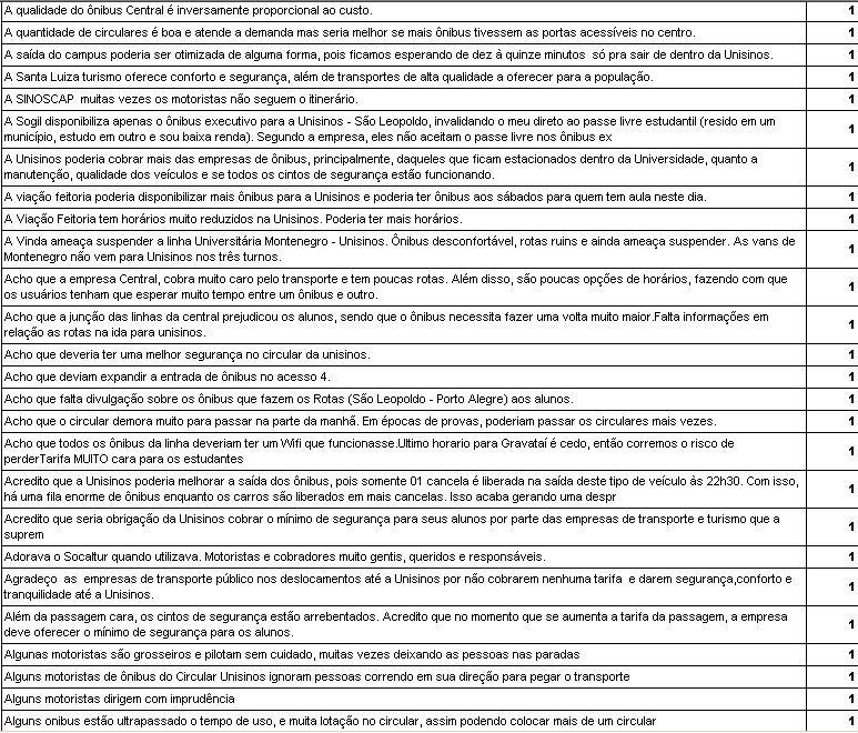Não resposta 841 86,4% Segurança 10 1,0% Custo mais baixo 19 2,0% Facilidade 3 0,3% Necessidade 6 0,6% Proximidade 10 1,0% Mais horario 12 1,2% Tarifa, proximidade e horário 2 0,2% Horários, conforto e segurança 1 0,1% Comodidade 2 0,2% Comodidade e economia 1 0,1% Comodidade e proximidade 1 0,1% Conforto, horários, tempo de viagem. 1 0,1% Conforto, tarifa e segurança 3 0,3% Horários e segurança. 5 0,5% Não necessito 9 0,9% Horario e tarifa 9 0,9% Facilidade e baixo custo 1 0,1% Falta de outro transporte. 19 2,0% Rapidez 3 0,3% Horário e qualidade adequada 1 0,1% Maior renda familiar 1 0,1% Não temcomo, sou de Sapiranga 1 0,1% Praticidade 1 0,1% Segurança e custo baixo 2 0,2% Segurança e praticidade. 2 0,2% Segurança e proximidade 1 0,1% Tarifa justa, horários variados,conforto(mínimo),agilidade 1 0,1% Utilizo o transporte publico 3 0,3% Segurança e conforto 2 0,2% TOTAL OBS. 0 0,0% Total 973 100,0%