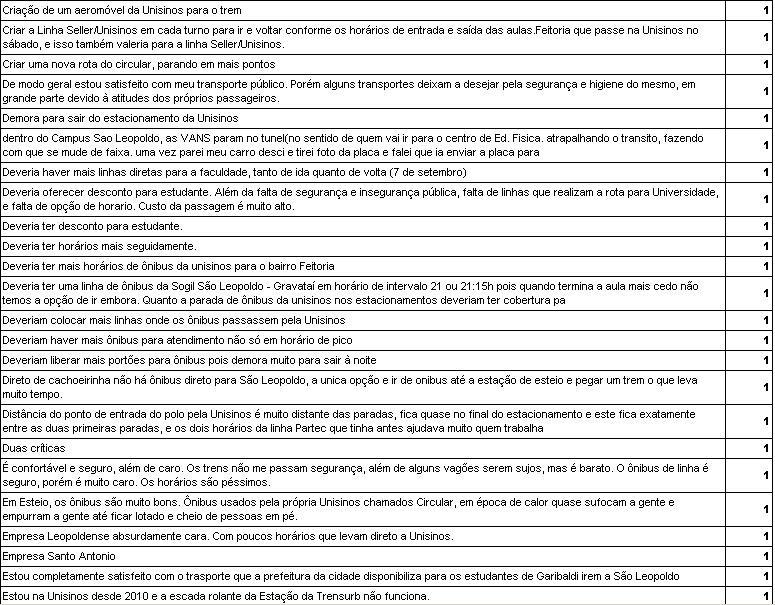Não resposta 651 66,9% Trensurb 56 5,8% Transporte municipal de São Leopoldo 128 13,2% Não uso 10 1,0% Circular 8 0,8% Nova Palmira 5 0,5% Transporte fretado van/ônibus 66 6,8% Hamburguesa 4 0,4% São jose 3 0,3% Sogal 3 0,3% Vicasa 4 0,4% Fátima 2 0,2% Pinhalense 2 0,2% Soul e Trensurb 2 0,2% STS 2 0,2% TM3 2 0,2% Transporte próprio 2 0,2% Vicasa e Sogal 3 0,3% Bento Transportes 1 0,1% Caxiense, depois urbano da BEM(fora do meu horario de aula) e Nova Palmira (no horario de aula) 1 0,1% Central - Trensurb 1 0,1% Evel (empresa de Viamão) e tresurb 1 0,1% Expresso rio guaíba 2 0,2% Expresso Vitória até Porto Alegre 1 0,1% Local - Fretamento utilizado na empresa onde trabalho 1 0,1% METROPLAN 1 0,1% Metroplan, Expresso Rio Guaiba 1 0,1% MOB ECARRIS 1 0,1% MOB Transportes e Trensurb 1 0,1% Ônibus de porto alegre 2 0,2% Pinhalense. 1 0,1% Real Rodovias 2 0,2% Santa Luiza e Santo Antônio 1 0,1% Trans alto feliz 1 0,1% Trensurb , carris e vicasa 1 0,1% Unesul 1 0,1% TOTAL OBS. 0 0,0% Total 973