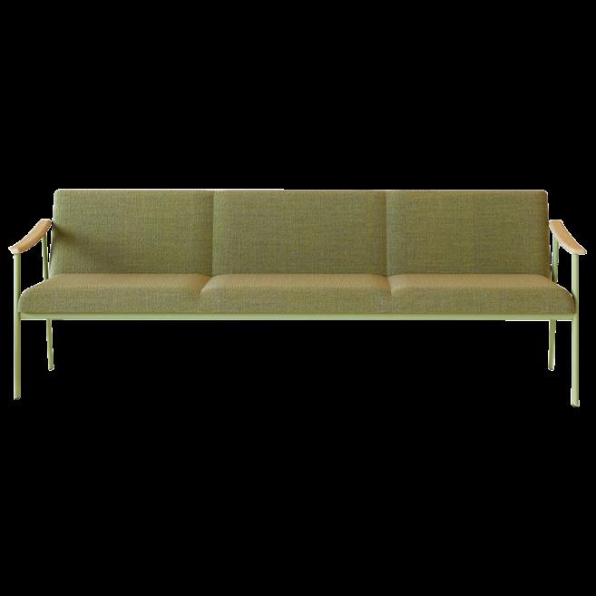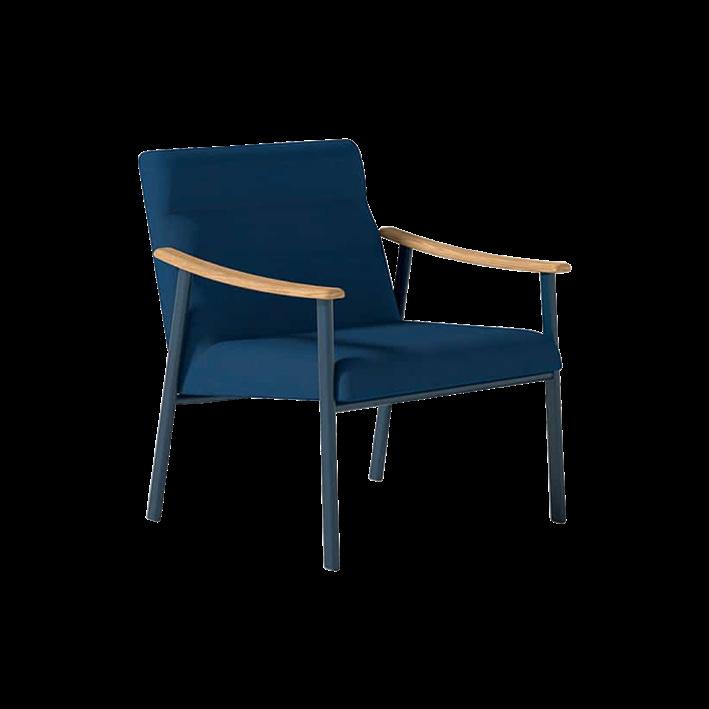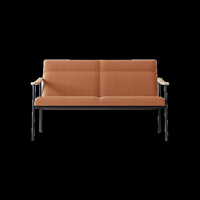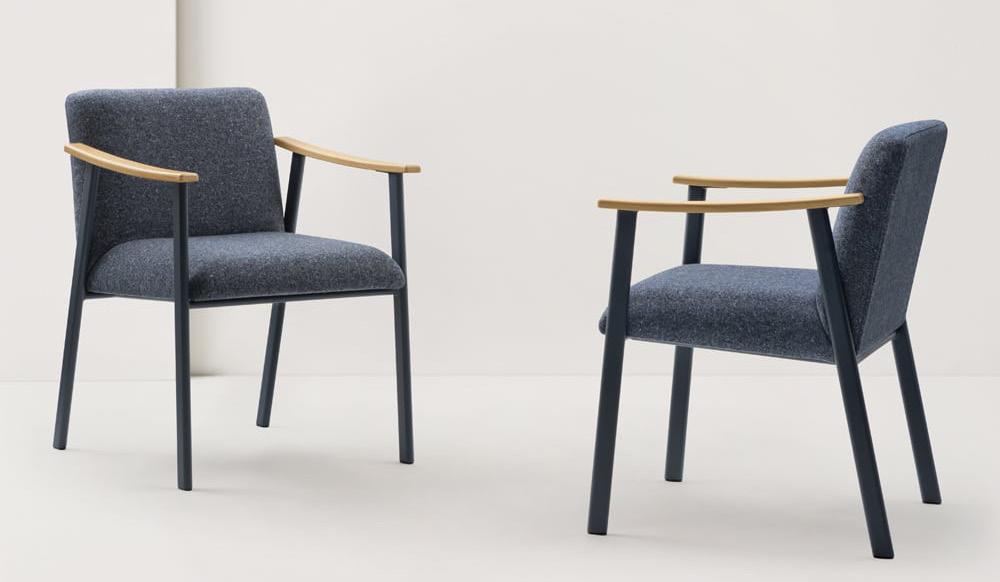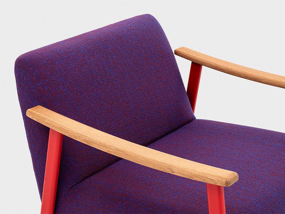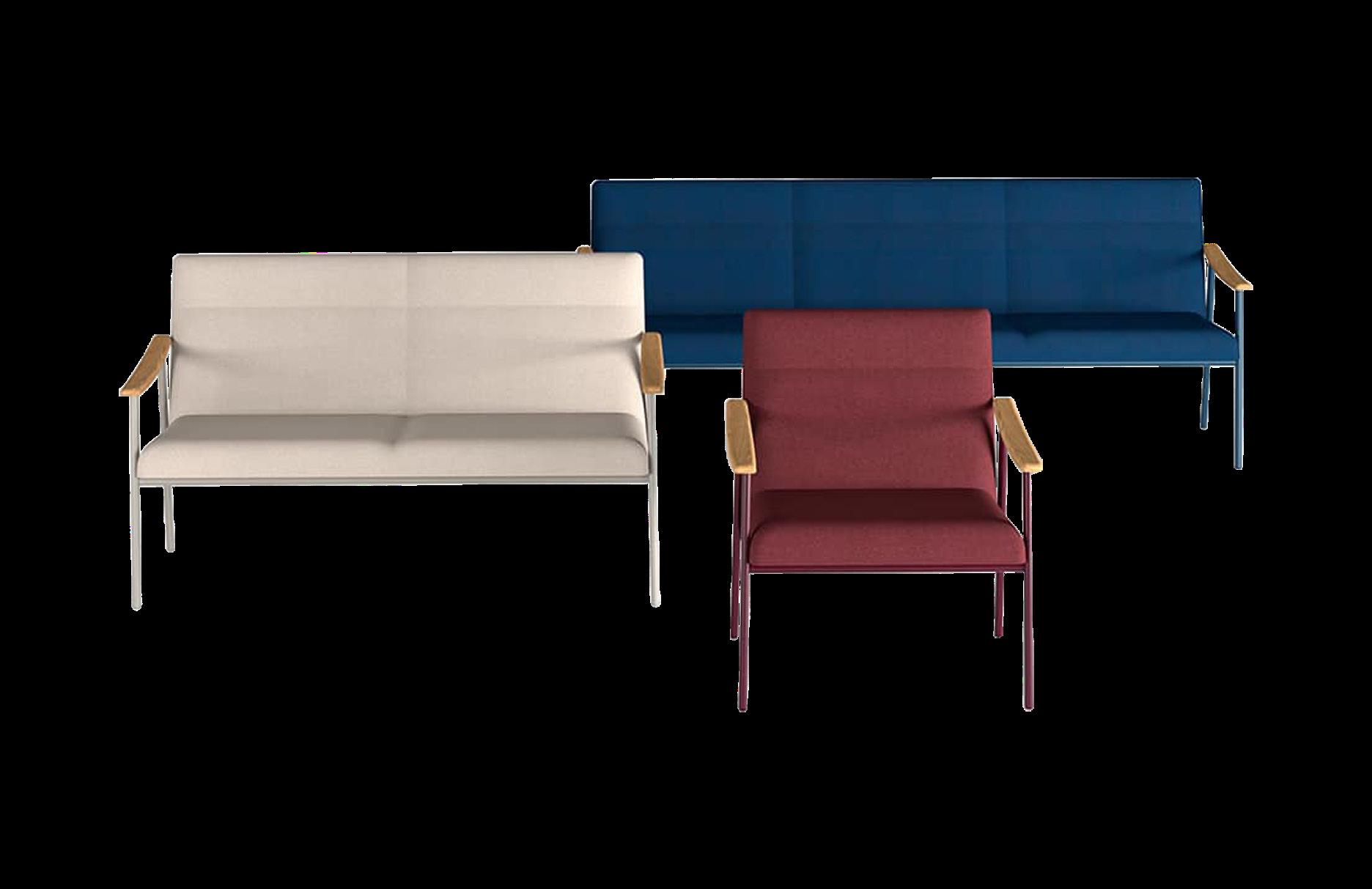 Armchair and Sofa 2/3 seats, available with two different type of backrest. Collection with a strong graphic character, essential in the lines, but with a sophisticated appearance, suitable for healthcare environments and working spaces. Frame in oval steel tube profile with powder coated finish and armrests in oak solid wood.