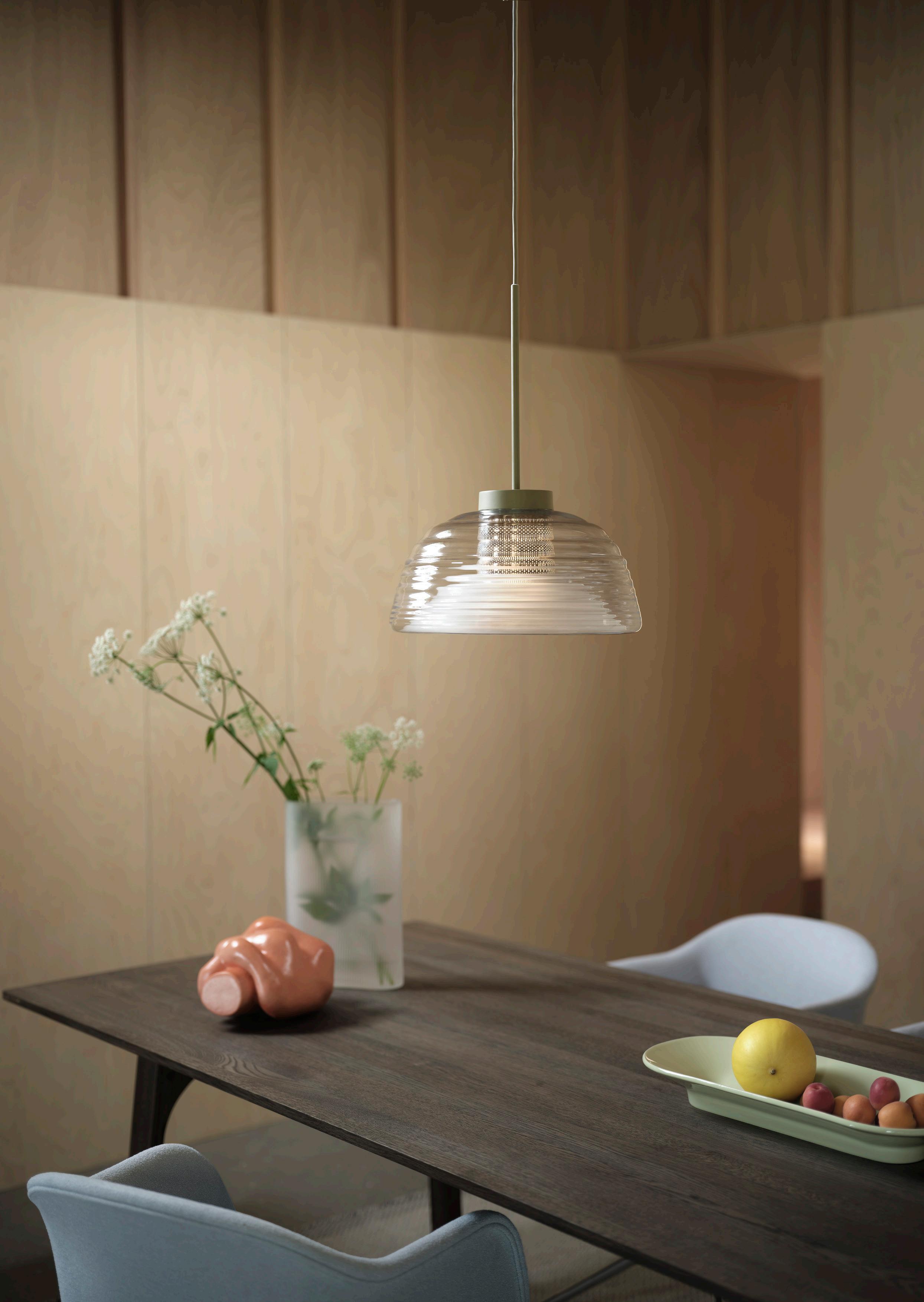 The Two Layer Pendant combines two types of light— directional functional light for the table, and comfortable ambient light —in one lamp. The mouth-blown glass softly diffuses the light, highlighting the material’s distinct quality and its small imperfections. The design translates classic Scandinavian principles of good lighting, often the result of several different light sources, capturing that quality in a single refined object.