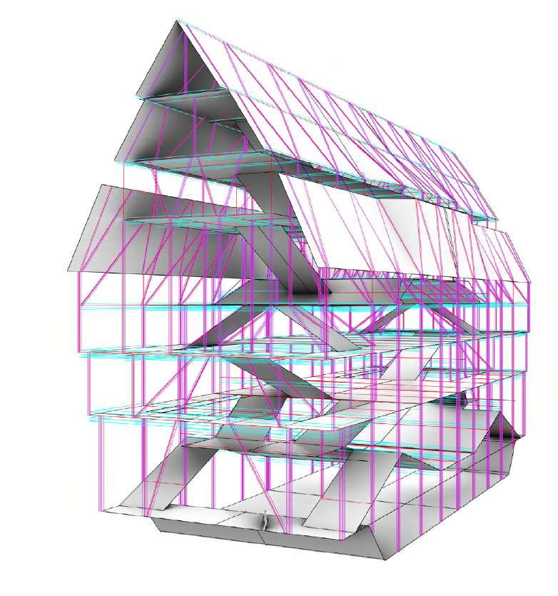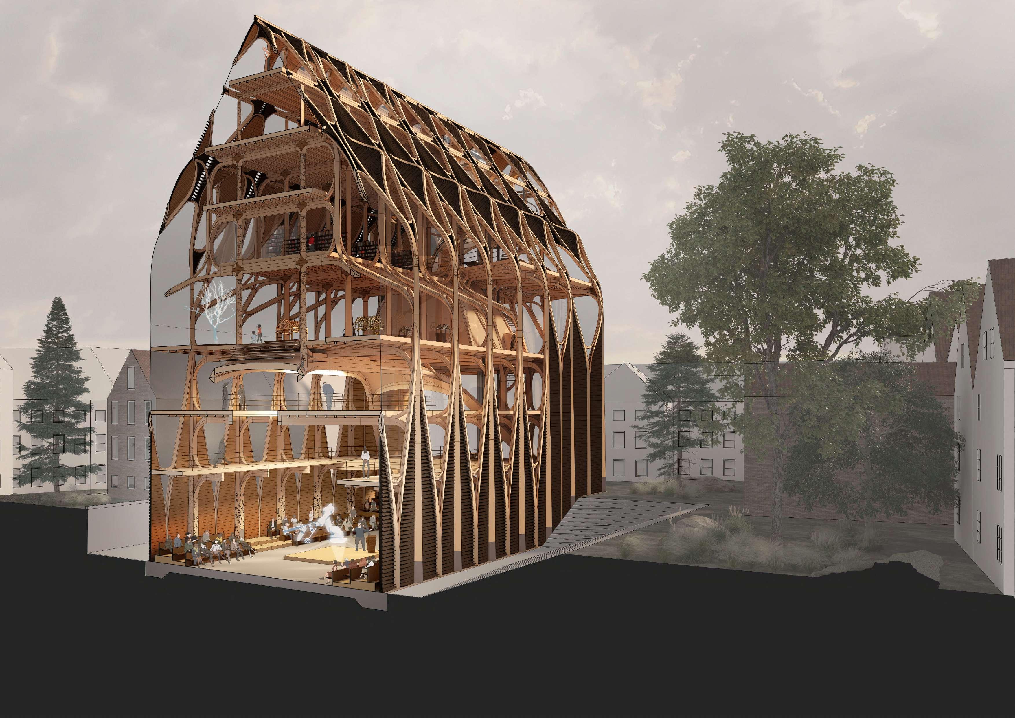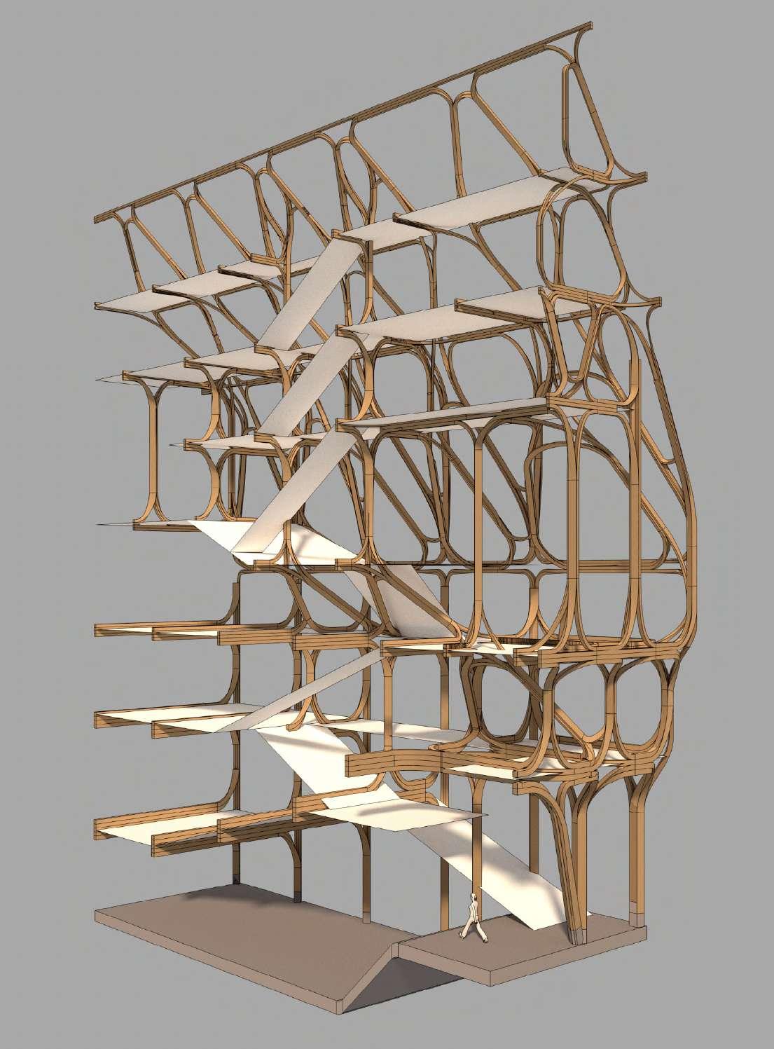 The project imagines a future guildhouse for timber framers (Zimmerleute), sited in the northern German city of Lübeck, building on the history of this dead but formerly valuable typology. Working from a research phase investigating the possibilities of a complex series of nodal glulam components, the project speculates on the development of glulam fabrication technologies specifically with a focus on connection strategies (which typically govern the performance of timber structures). The building is made up of a series of prefabricated components with nodal connections built in which can be assembled on site. The project looks to leverage the expressive possibilities of the system, treading the line between referencing the traditions of craftsperson organisation in Germany and a future typology influenced by digital possibilities.