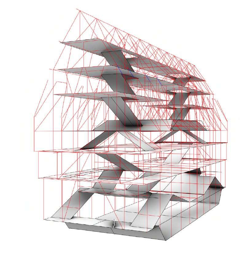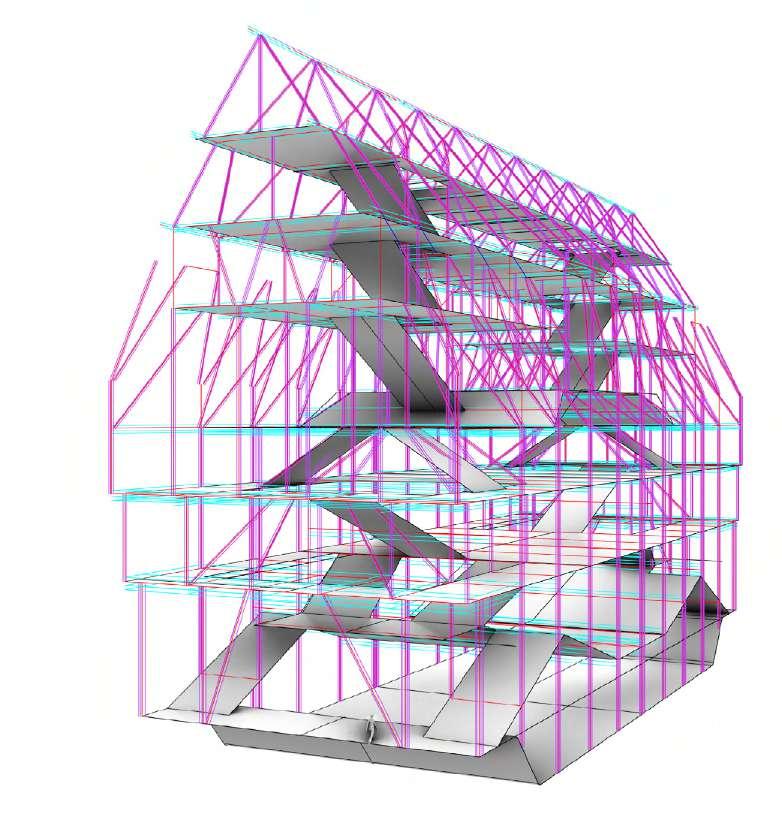 The lift core at the rear of the building functions as a service riser and utility stair. The spiral option is chose due to the constrained vertical nature of the building’s organisation. Seamless integration of servicing is designed into the intelligent structure.