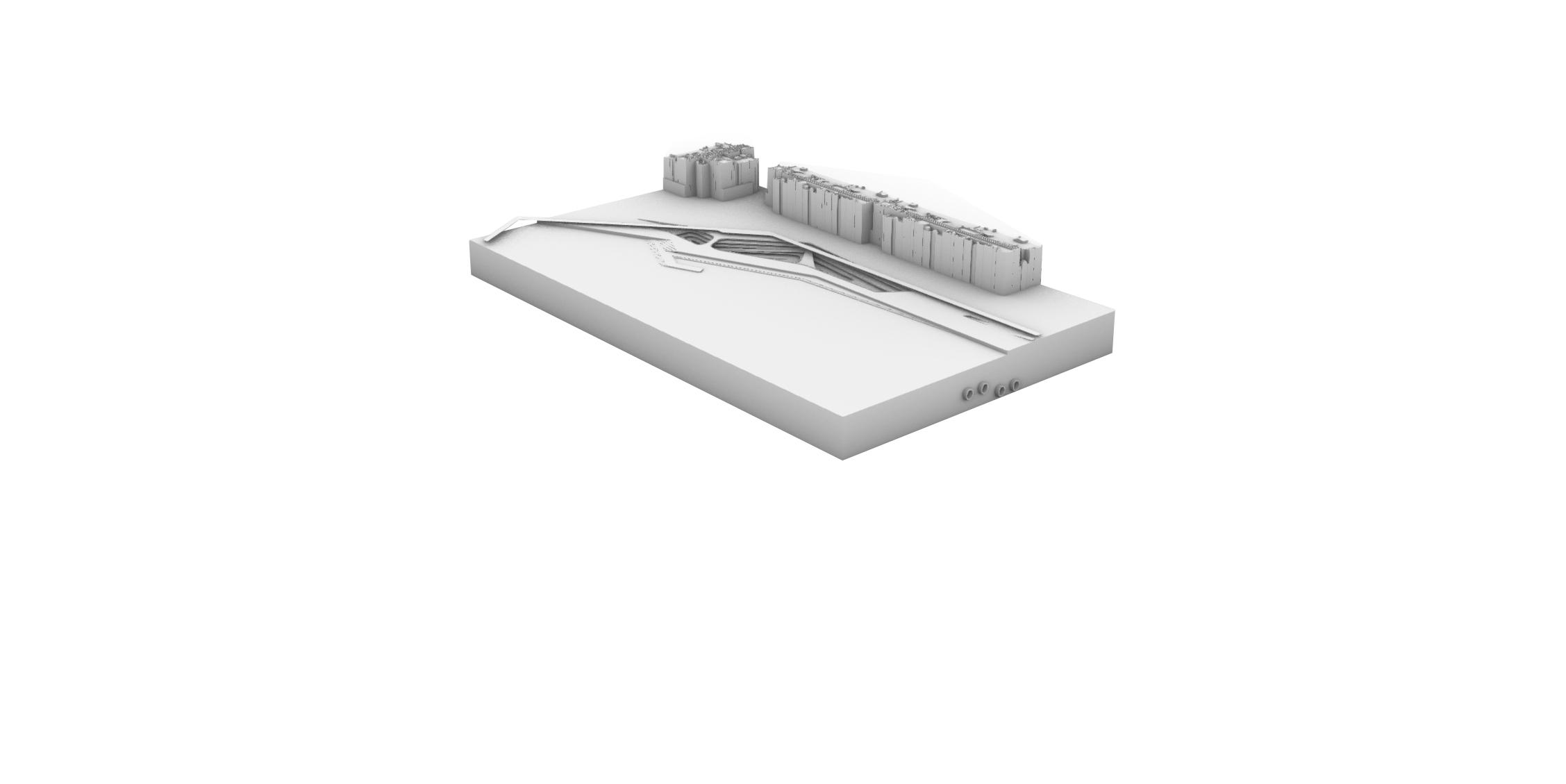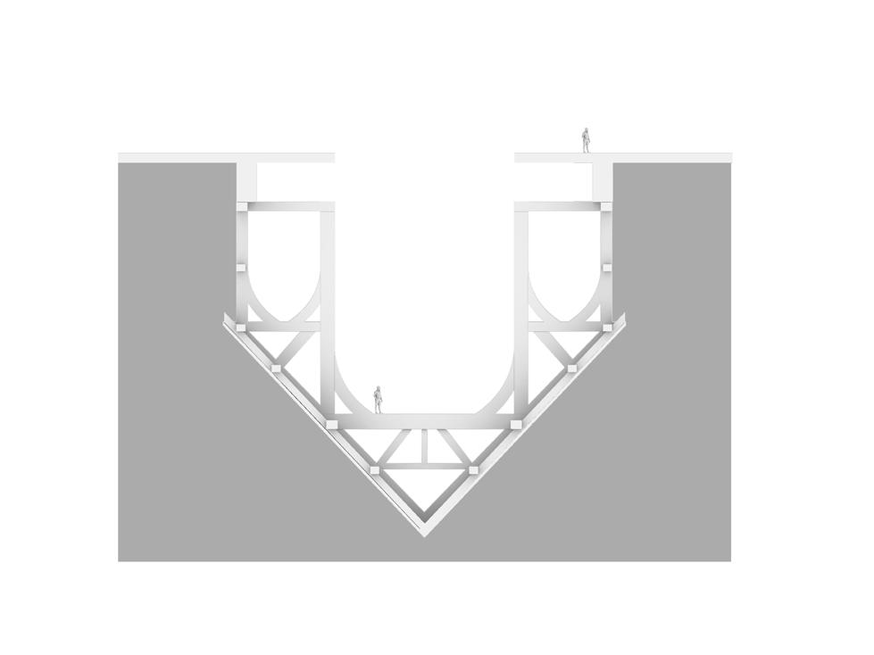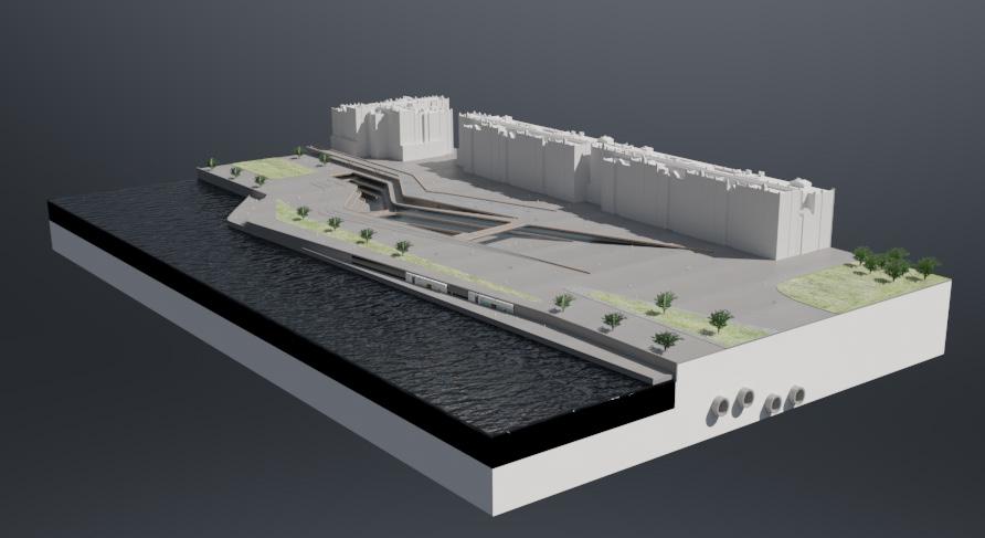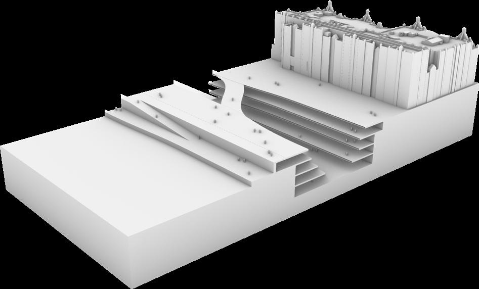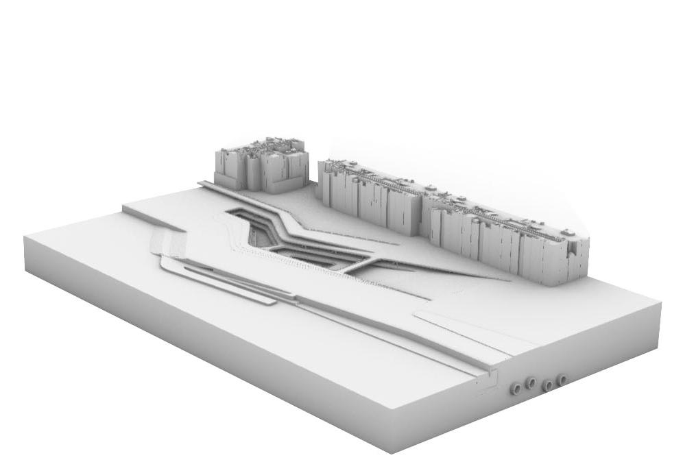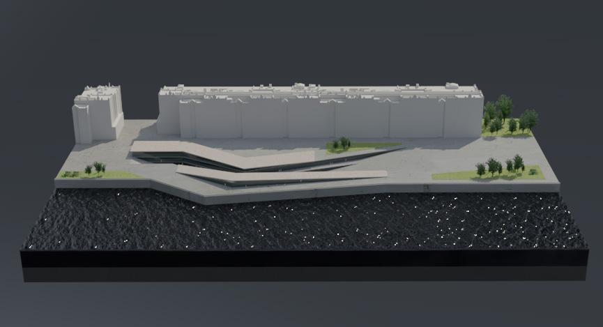 EXPLORATION Testing the principals of a canyon style form in the context of a riverside, city center site. These tests bring in elements of the programme such as the use of tube tunnels. Early tests included a simple roof plane continuing the structure above ground. 3.04