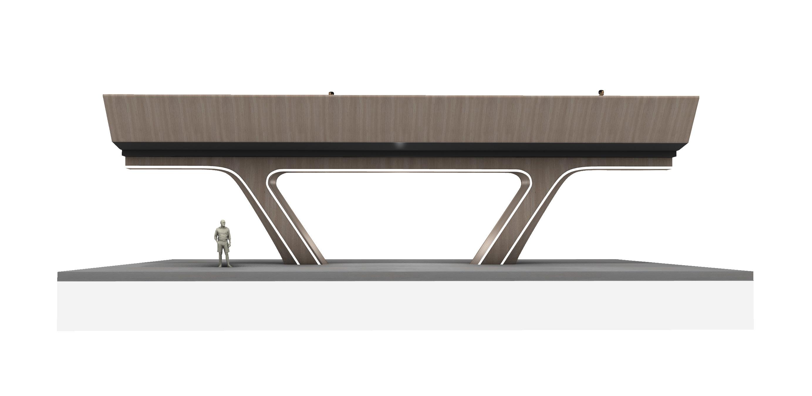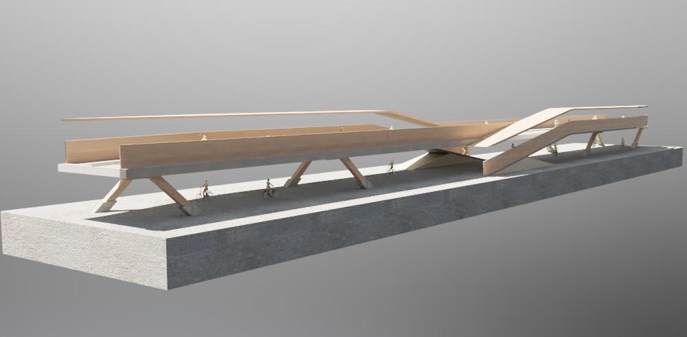 The High Line proposes elevated cycling platforms. This fragment tests the idea of a raised platform above the ground plane for safer, quicker and more efficient travel by bicycle around London. Glulam columns feed into a central beam running beneath the deck to create a fluid and dynamic design. The structure features LED lighting along the columns and underside of the deck to ensure the area below is well lit.