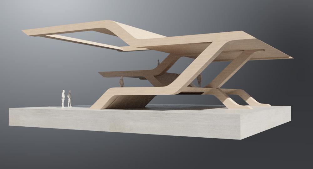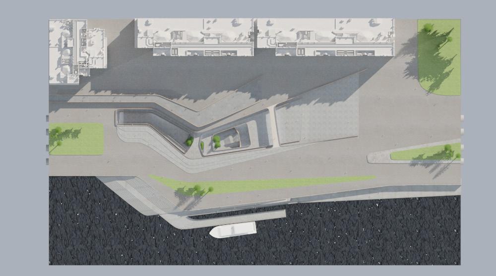 The global form is determined by access points from various parts of the site, as well as the movement of people through and around the site. The pier is first tested as an addition to the terrace, as well as the suggesting of new green spaces at ground level.