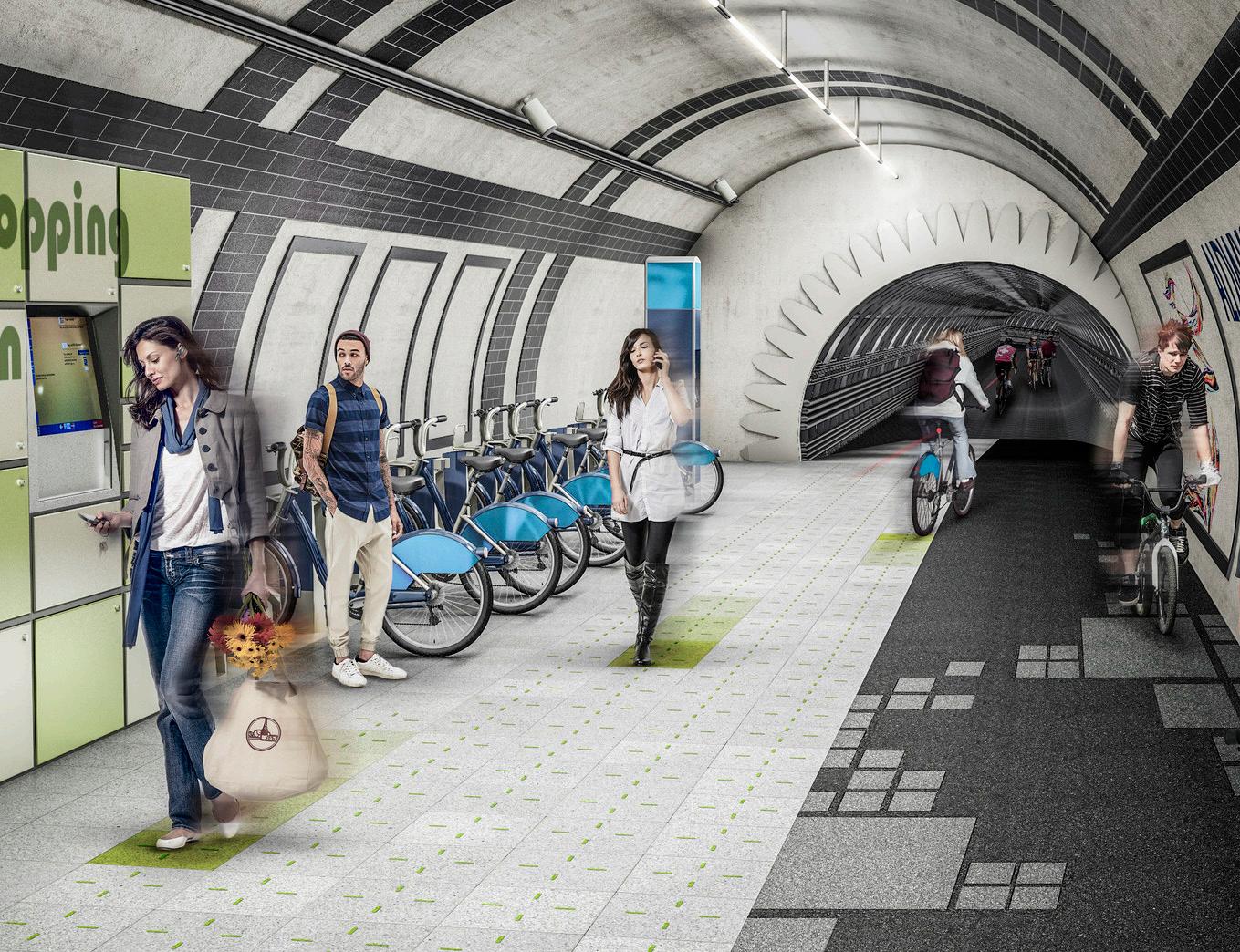 Another possibility of using existing infrastructure is underground. Multiple run under London, connecting key points in the city. The proposal is to refurbish these tunnels to become cycle routes.