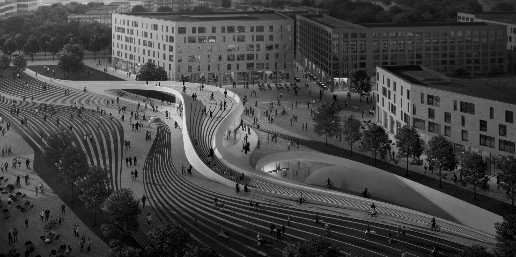 of subterranean architecture allow for the space at ground level to be used as public realm, as well as offering unobstructed views over the site.