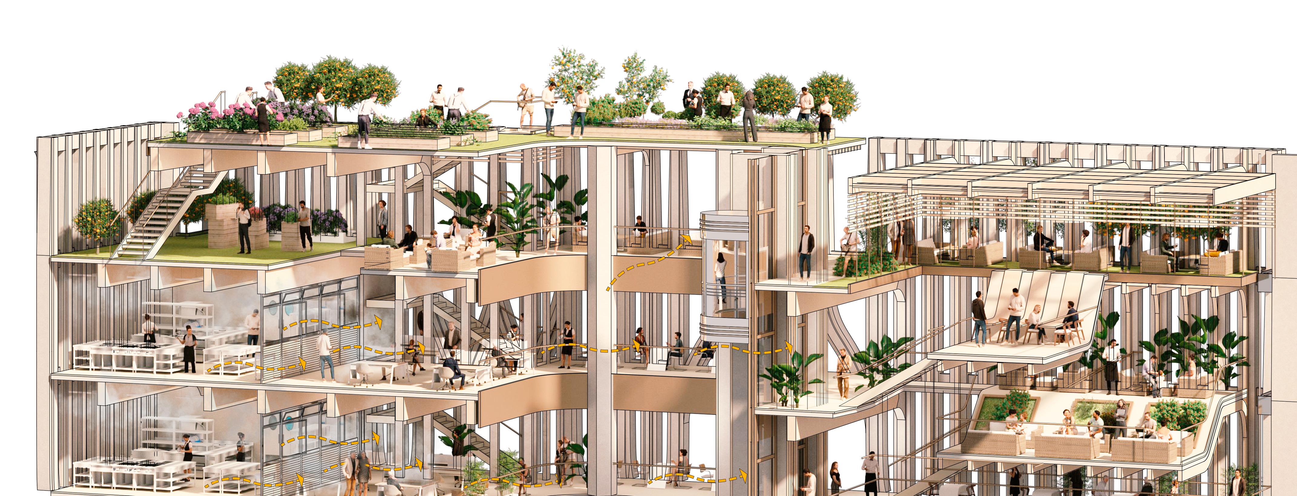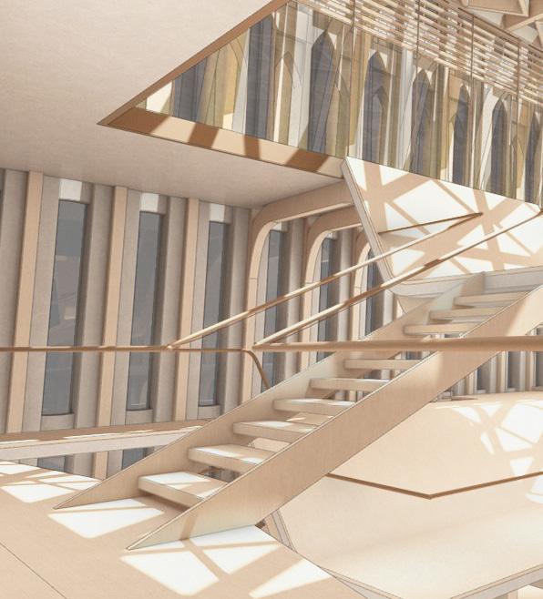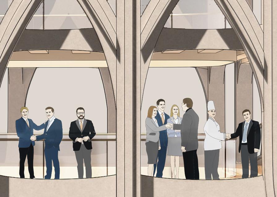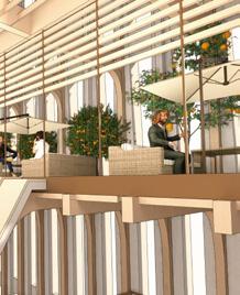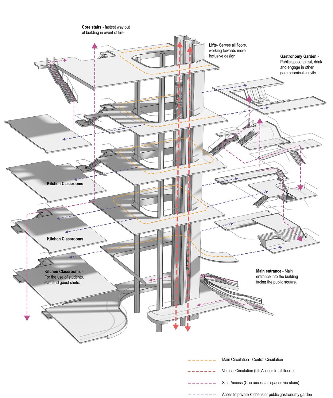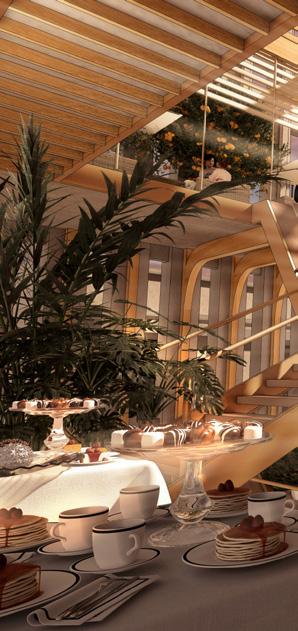 The Gastronomy Garden proposes a new approach to eating that breaks down the spatial and performative barriers present in the more traditional restaurant typology which tends to create a more isolated and closed eating process that can limit social engagement and interaction within one’s own table and party. The ICCA invites a more dynamic take, where each floor presents a different course and unique gastronomical environment tailored to said course, which belongs to a wider 10-12 course menu elaborated by students daily. As one makes their way up eating, it becomes an opportunity to interact and socialise with people around you as you eat, which is something Catalan people love to do. Furthermore, by having an openand nterconnected vertical garden, it becomes a very tangible experience with visual, olfactory, tactile, aural and gustative interactions and intersections.