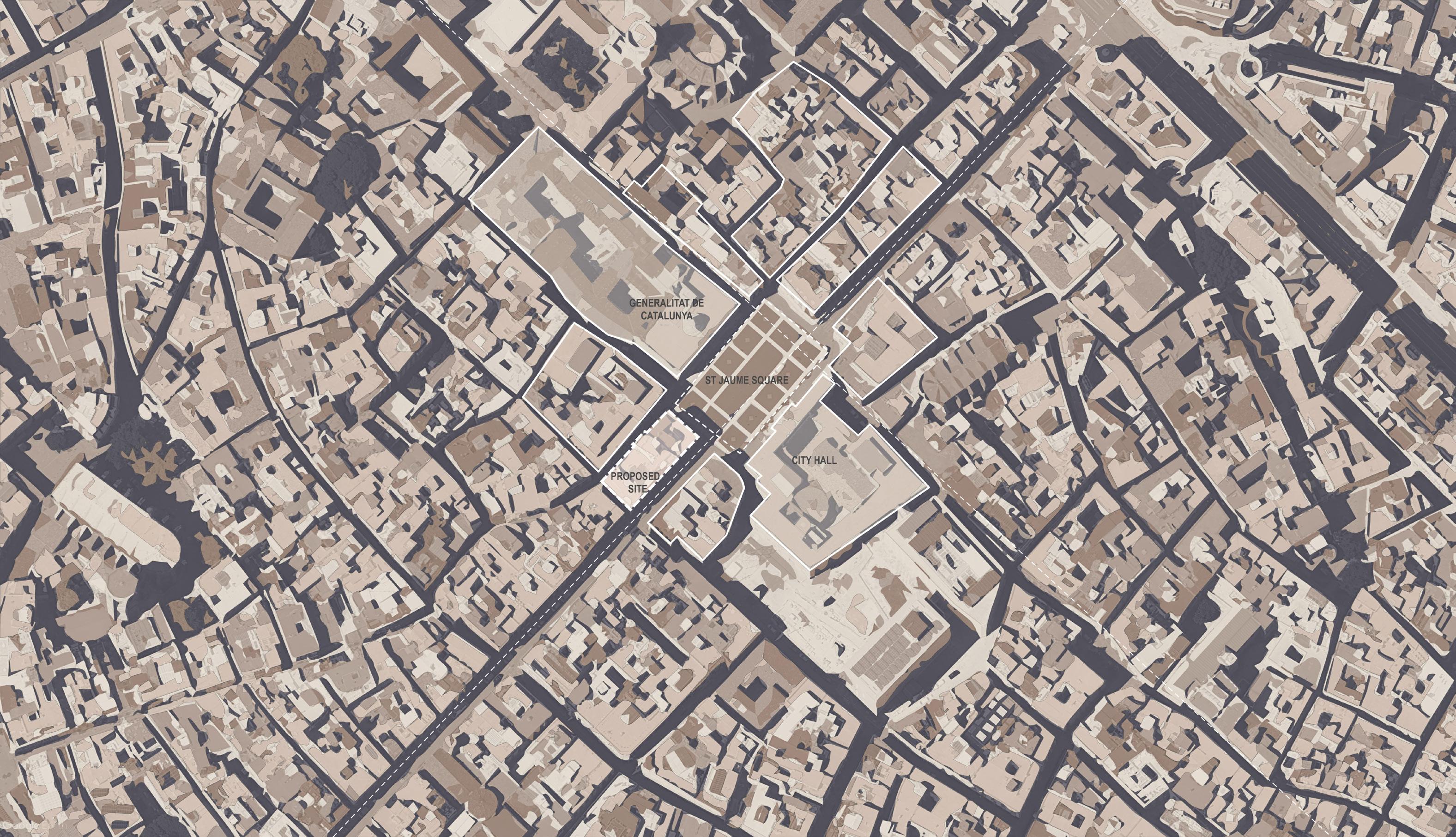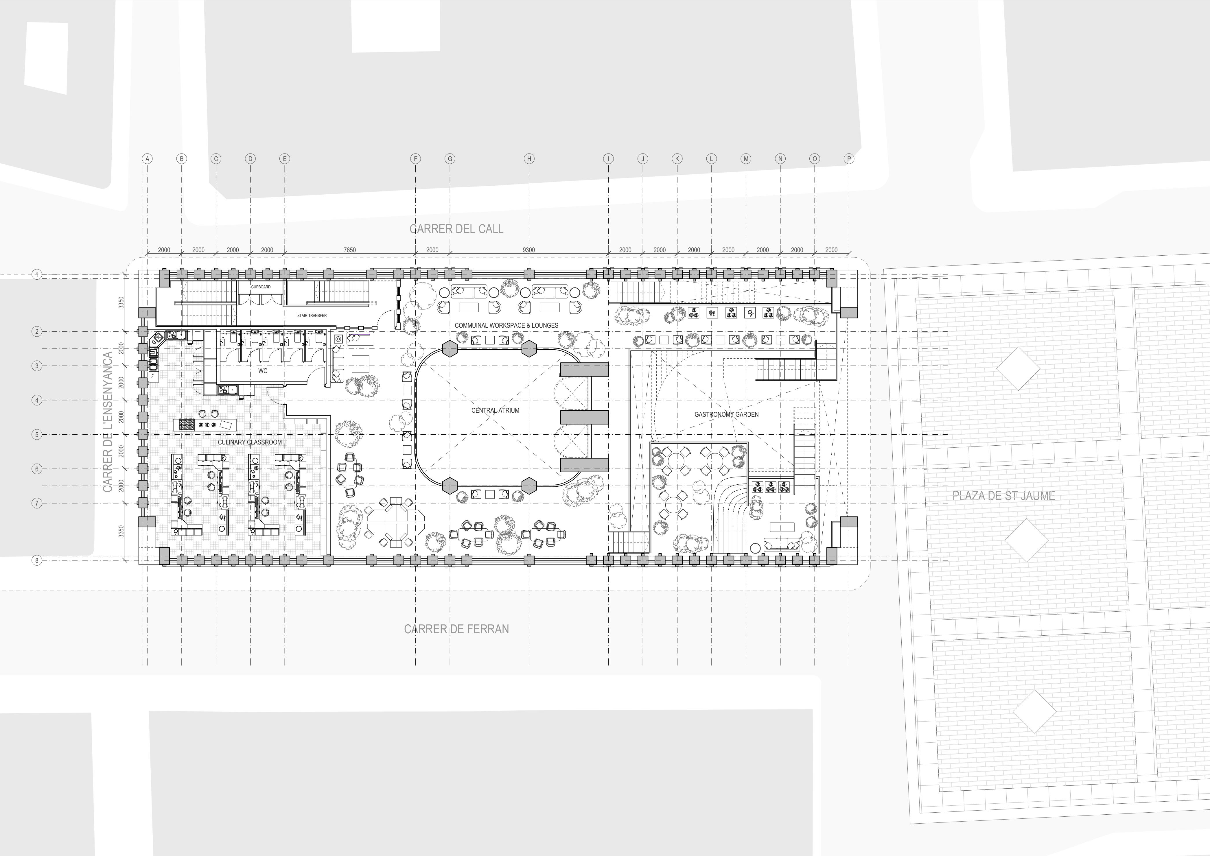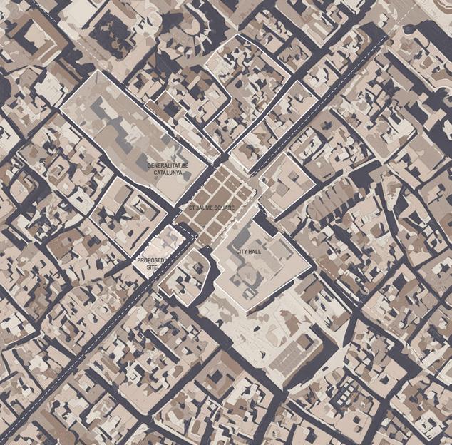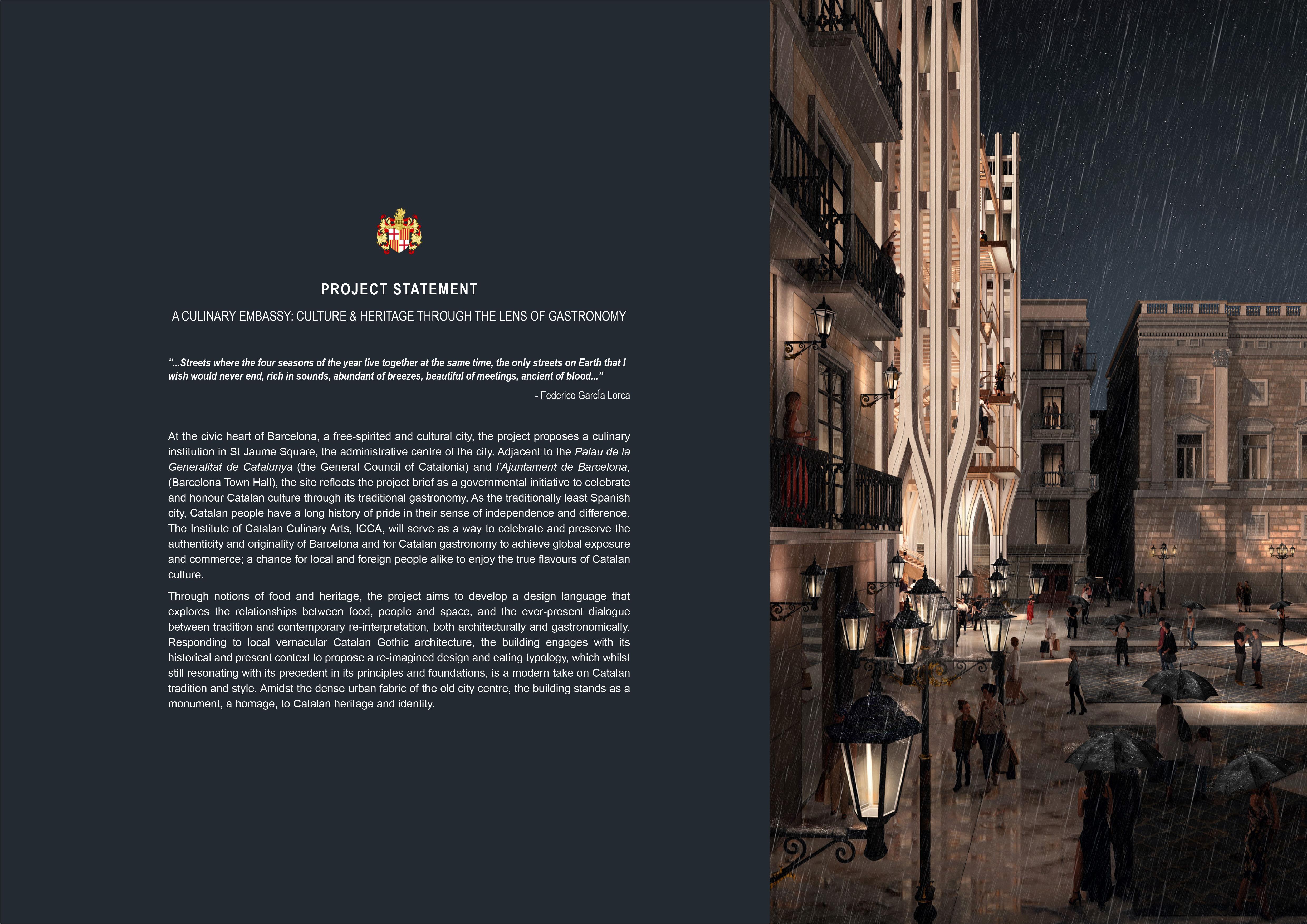 At the civic heart of Barcelona, a free-spirited and cultural city, the project proposes a culinary institution in St Jaume Square, the administrative centre of the city. Adjacent to the Palau de la Generalitat de Catalunya (the General Council of Catalonia) and l’Ajuntament de Barcelona, (Barcelona Town Hall), the site reflects the project brief as a governmental initiative to celebrate and honour Catalan culture through its traditional gastronomy. As the traditionally least Spanish city, Catalan people have a long history of pride in their sense of independence and difference. The Institute of Catalan Culinary Arts, ICCA, will serve as a way to celebrate and preserve the authenticity and originality of Barcelona and for Catalan gastronomy to achieve global exposure and commerce; a chance for local and foreign people alike to enjoy the true flavours of Catalan culture.