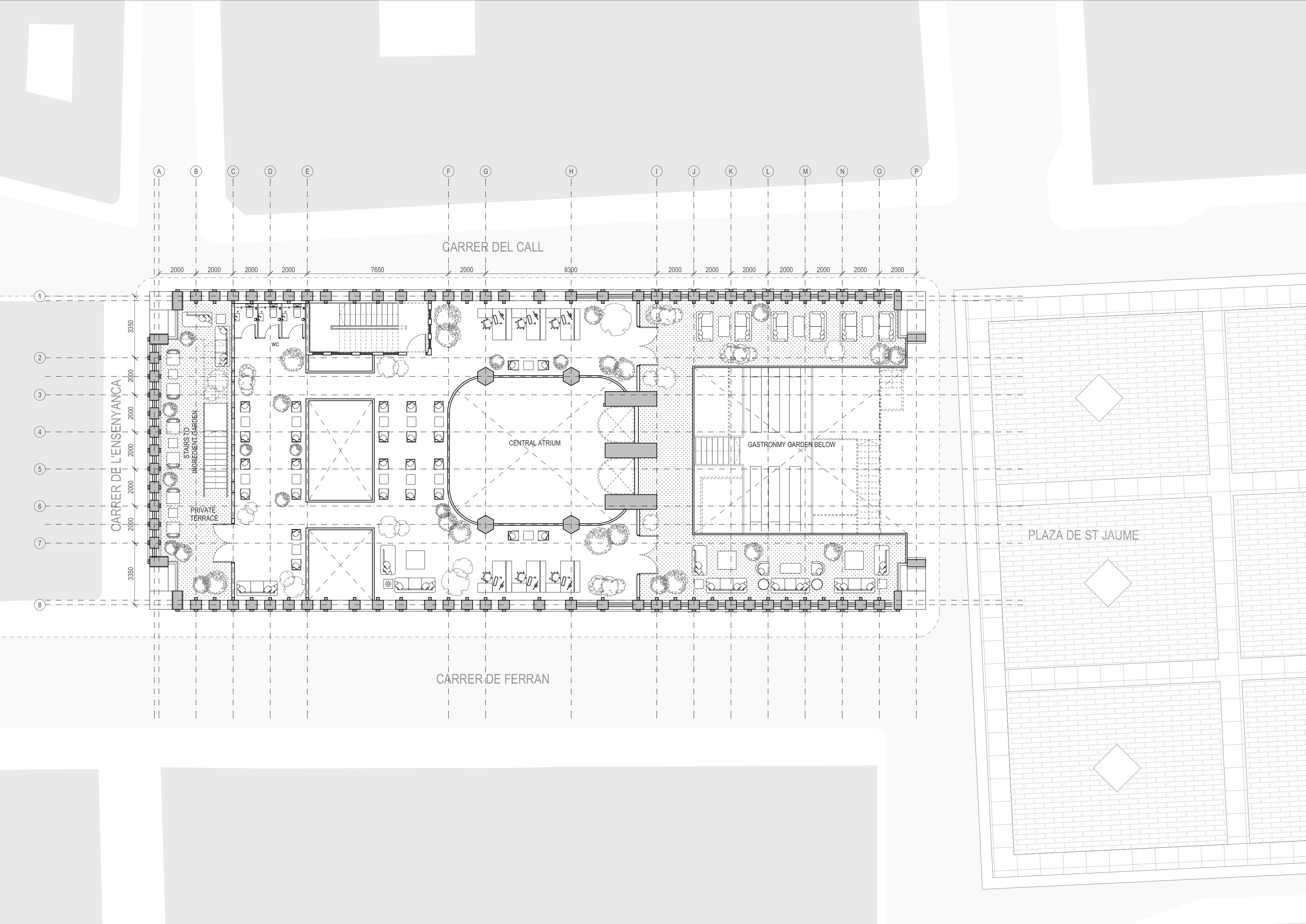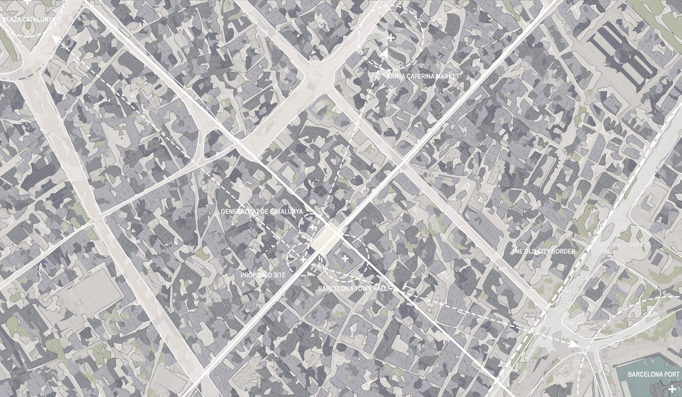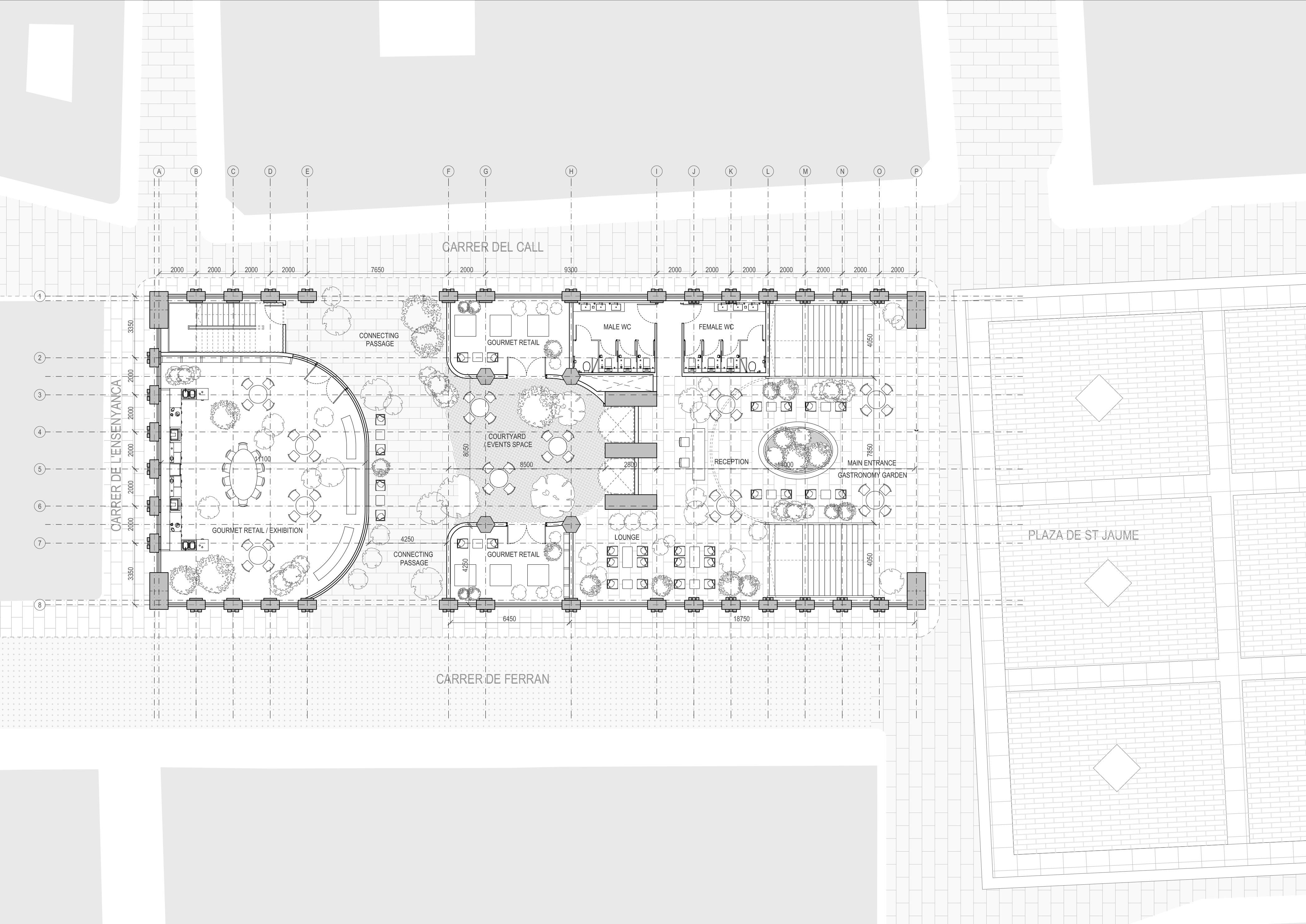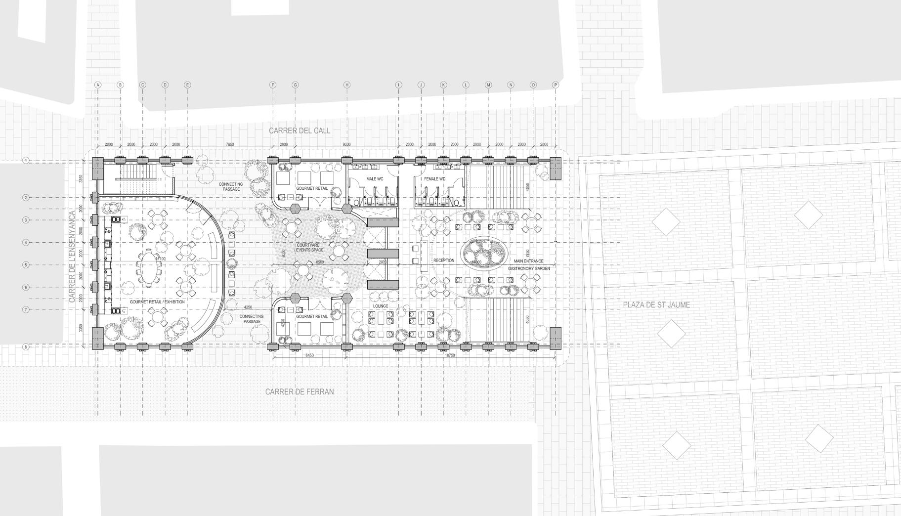 At the civic heart of Barcelona, a free-spirited and cultural city, the project proposes a culinary institution in St Jaume Square, the administrative centre of the city. Adjacent to the Palau de la Generalitat de Catalunya (the General Council of Catalonia) and l’Ajuntament de Barcelona, (Barcelona Town Hall), the site reflects the project brief as a governmental initiative to celebrate and honour Catalan culture through its traditional gastronomy. As the traditionally least Spanish city, Catalan people have a long history of pride in their sense of independence and difference. The Institute of Catalan Culinary Arts, ICCA, will serve as a way to celebrate and preserve the authenticity and originality of Barcelona and for Catalan gastronomy to achieve global exposure and commerce; a chance for local and foreign people alike to enjoy the true flavours of Catalan culture.