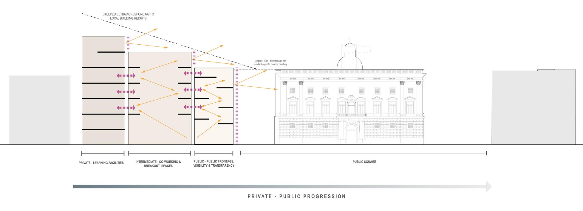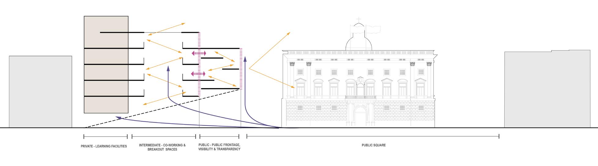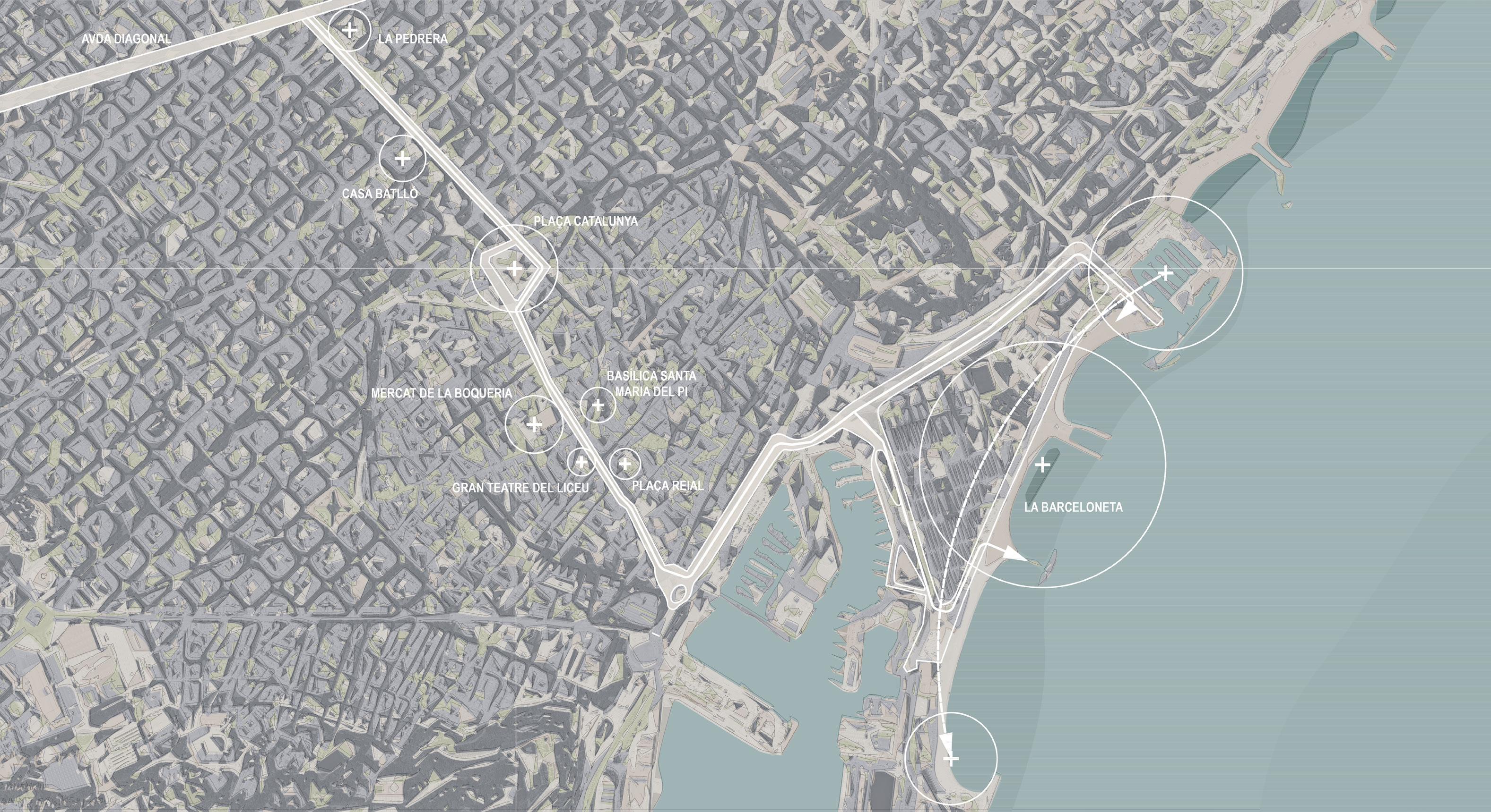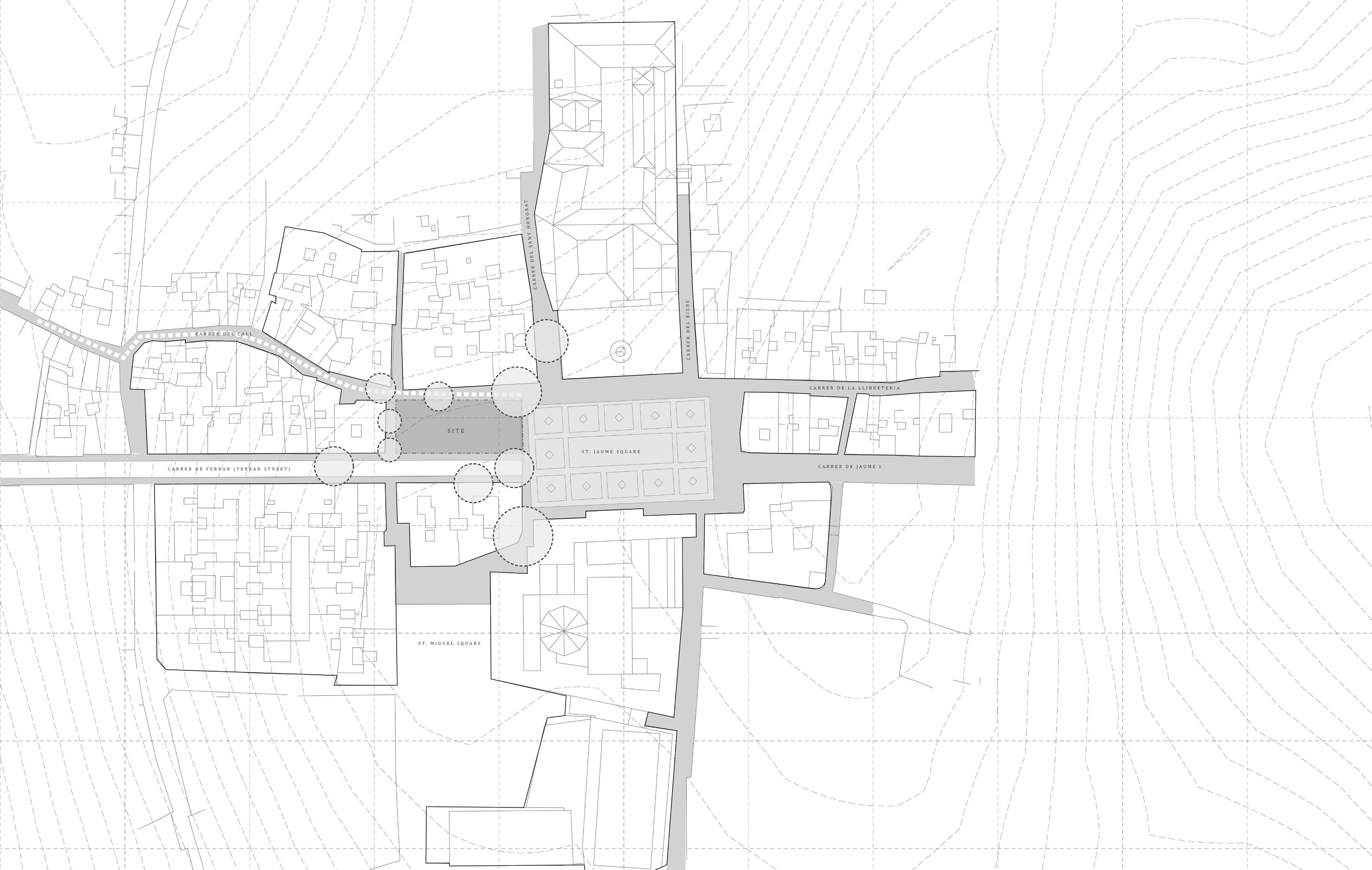 At the civic heart of Barcelona, a free-spirited and cultural city, the project proposes a culinary institution in St Jaume Square, the administrative centre of the city. Adjacent to the Palau de la Generalitat de Catalunya (the General Council of Catalonia) and l’Ajuntament de Barcelona, (Barcelona Town Hall), the site reflects the project brief as a governmental initiative to celebrate and honour Catalan culture through its traditional gastronomy. As the traditionally least Spanish city, Catalan people have a long history of pride in their sense of independence and difference. The Institute of Catalan Culinary Arts, ICCA, will serve as a way to celebrate and preserve the authenticity and originality of Barcelona and for Catalan gastronomy to achieve global exposure and commerce; a chance for local and foreign people alike to enjoy the true flavours of Catalan culture.