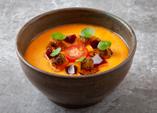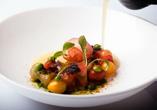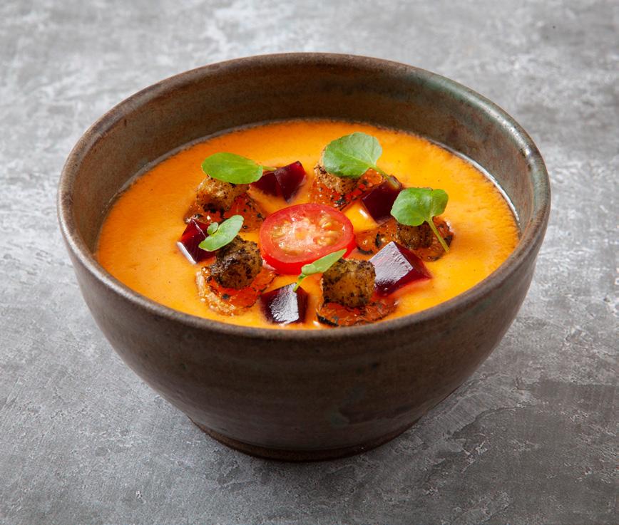 As with all tasting menus, the first course begines with a light soup, in this case “Gazpacho” Originating from Andalucía, the soup is extremely popular in summer and has been re-interpreted the Catalan way. A cold tomato-based soup with onion, pepper and cucumber to refresh the palette.