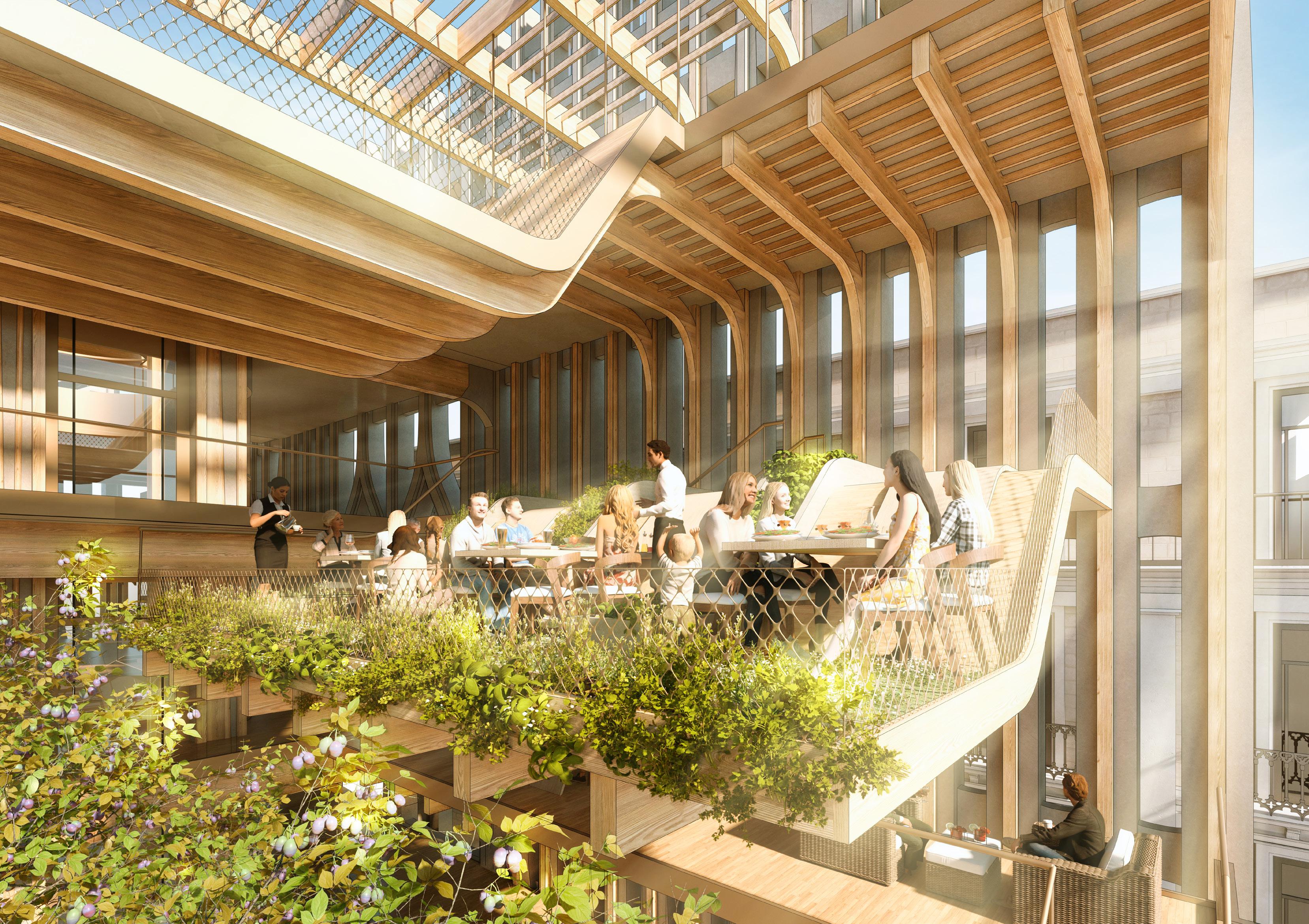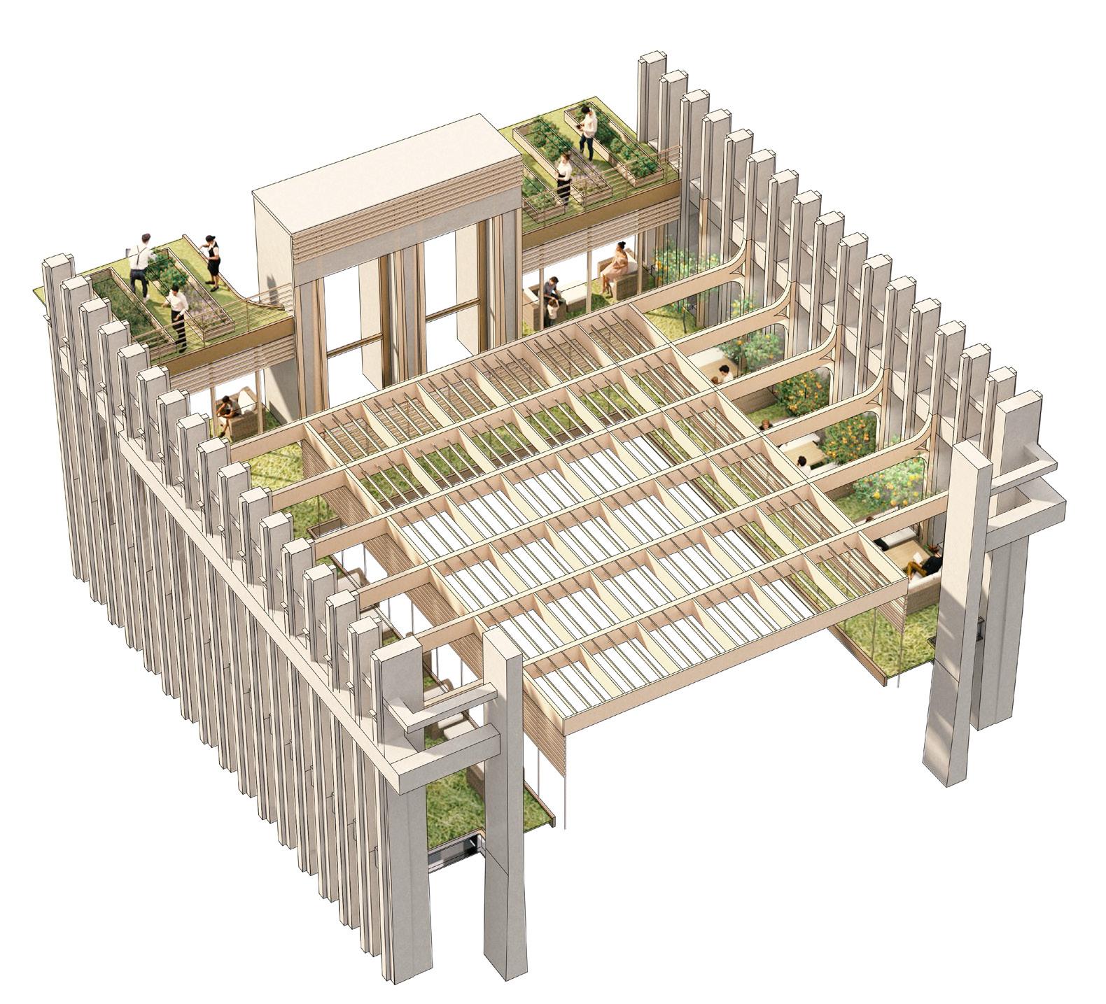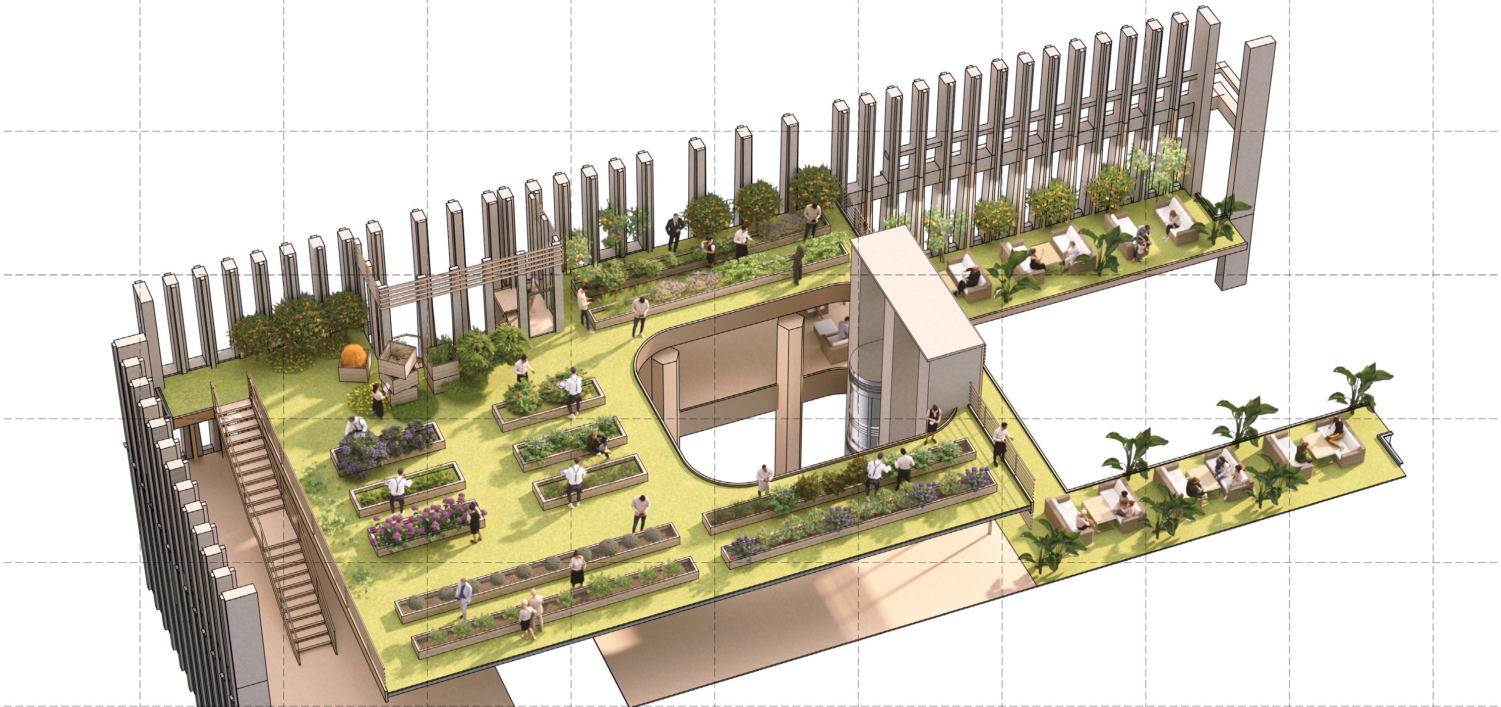 The lower level of the roof coincides with the front atrium’s top floor and is accessible to the public as a terraced eating space. It could be views as the final floor of the vertical garden.